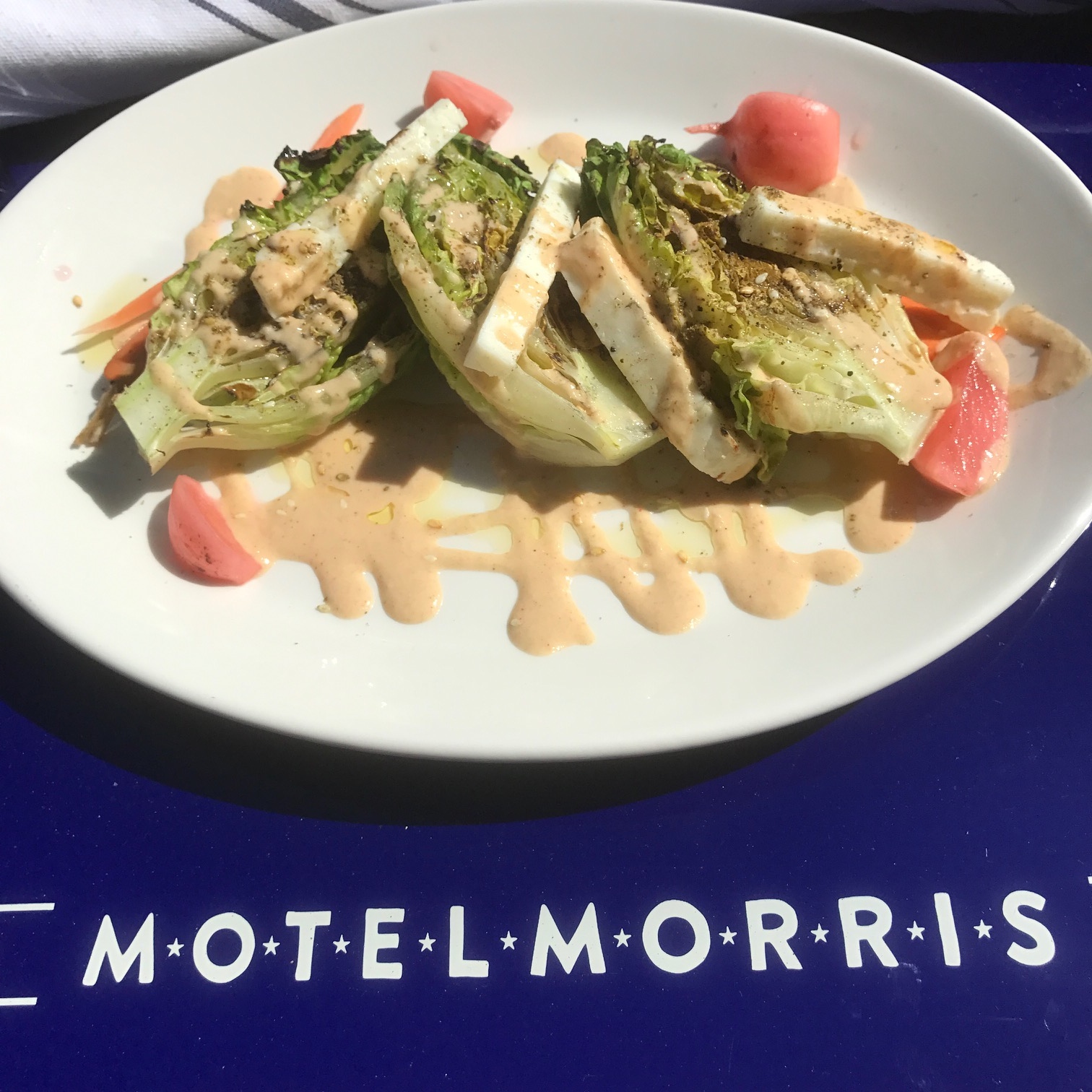 Grilled Little Gem Lettuce with pickled vegetables and za’atar lemon tahini was crisp and delicious accentuated by grilled Haloumi cheese ($14).