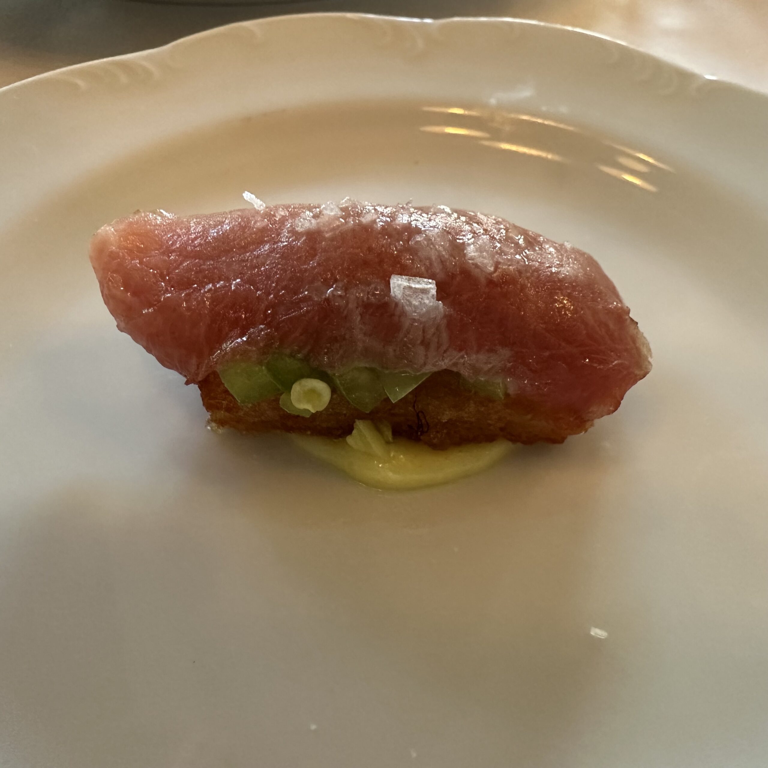 My dining companion ordered a tasty morsel, Bluefin Tuna with Guindilla Pepper and a Crispy Potato ($8).