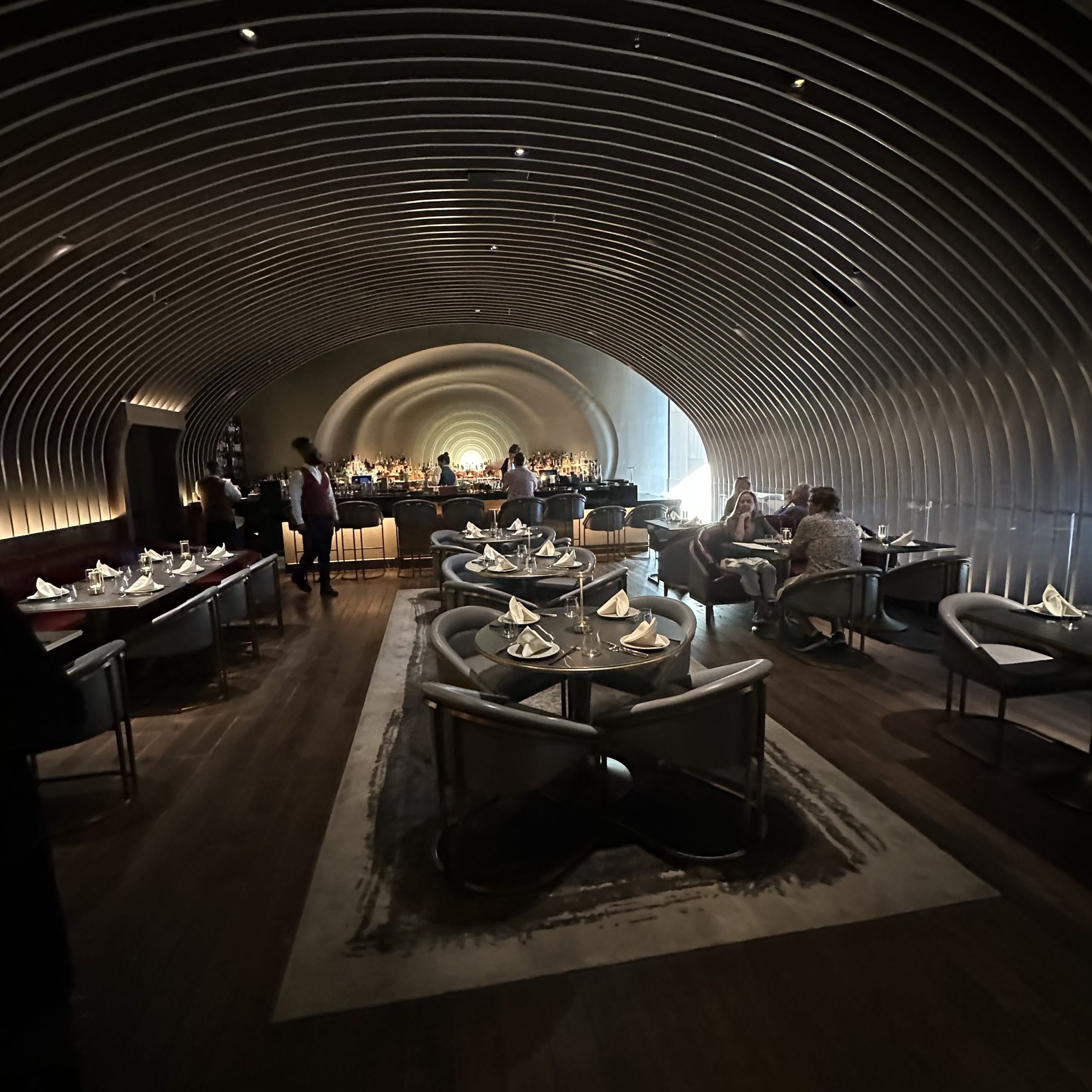 We were offered either dining upstairs or down. The upstairs is striking. The back lighting emphasizes the unique shape of the room.