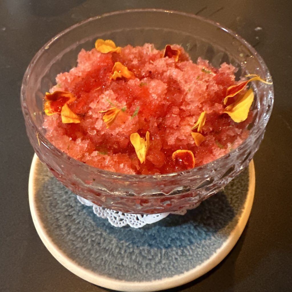 Dessert was a refreshing Watermelon Granita with strawberry, kinako rice, yuzu crème fraîche sorbet ($19).