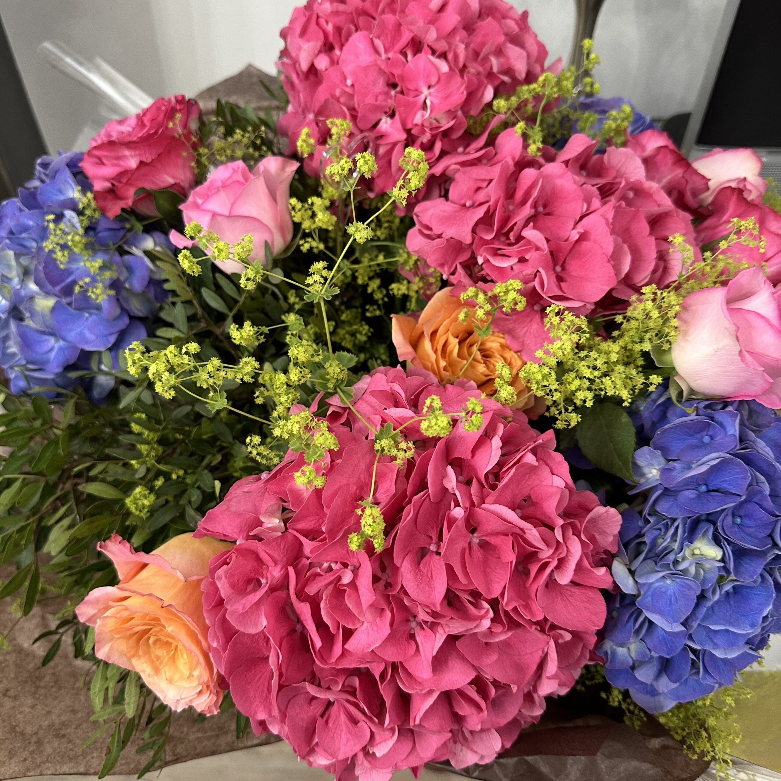 We arrived home and the doorman presented me with the most gorgeous bouquet of roses and hydrangeas.