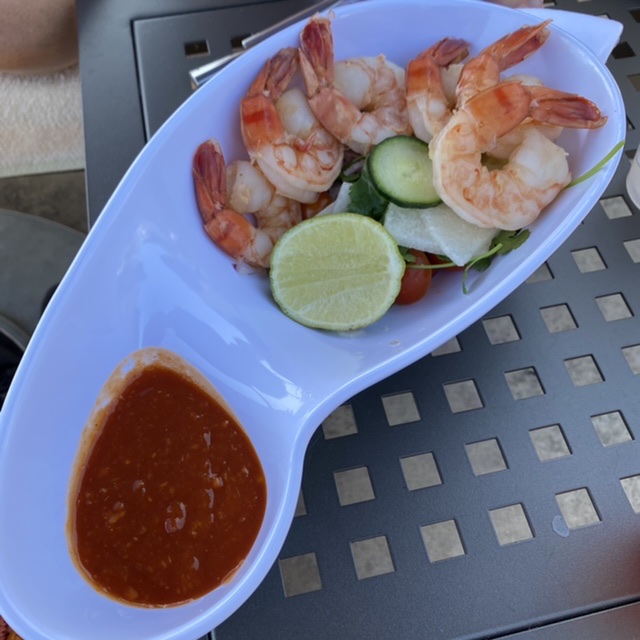 A charming server treated us to a delicious jumbo shrimp cocktail…good karma.