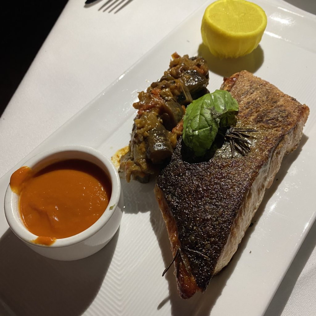 The entree was an exquisitely prepared Salmone alla Griglia with Eggplant accompanied by a comfortably spicy tomato dipping sauce ($30). I relished the crispy sear on the skin and the faultless preparation.