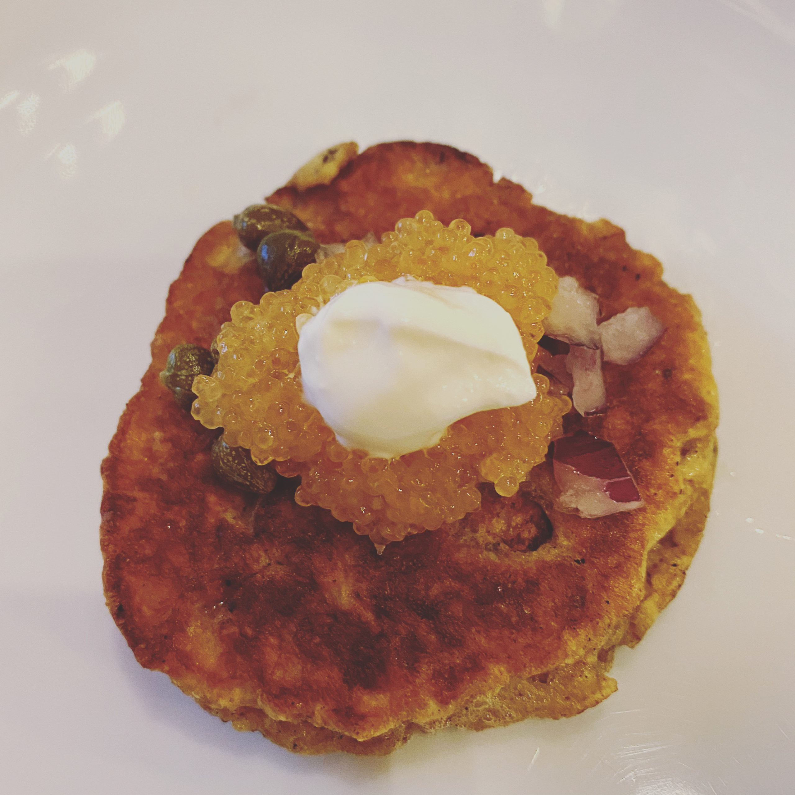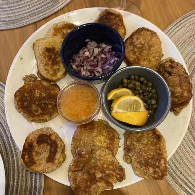 1. Great idea to use latkes. We usually use tiny boiled potatoes cut zin half with a little scooped out.