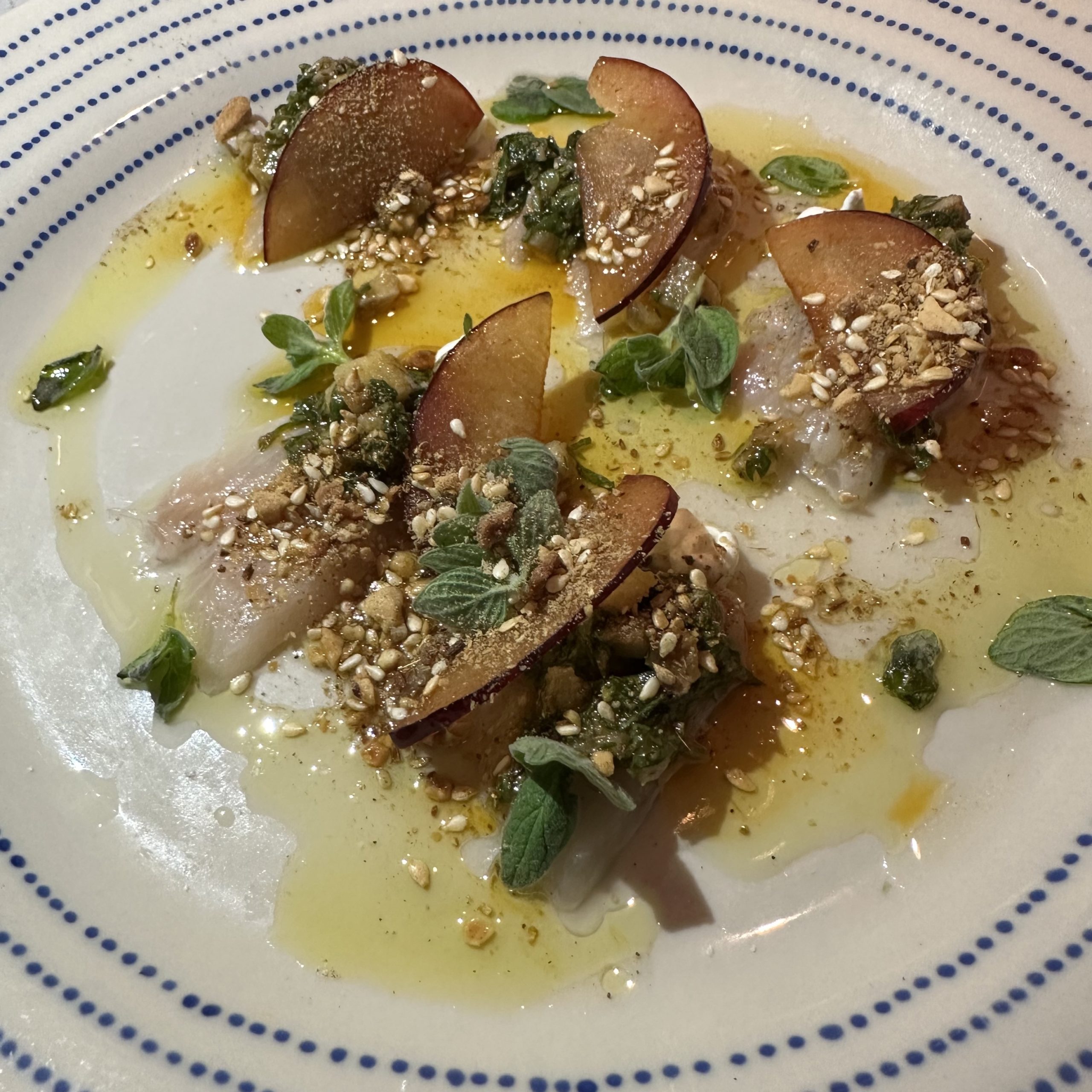 The Yellowtail Sashimi Alexandria 2.0 quickly followed with artichoke salsa, plums, labane cream, wading in a shallow, sumptuous pool of seasoned EVOO ($19).