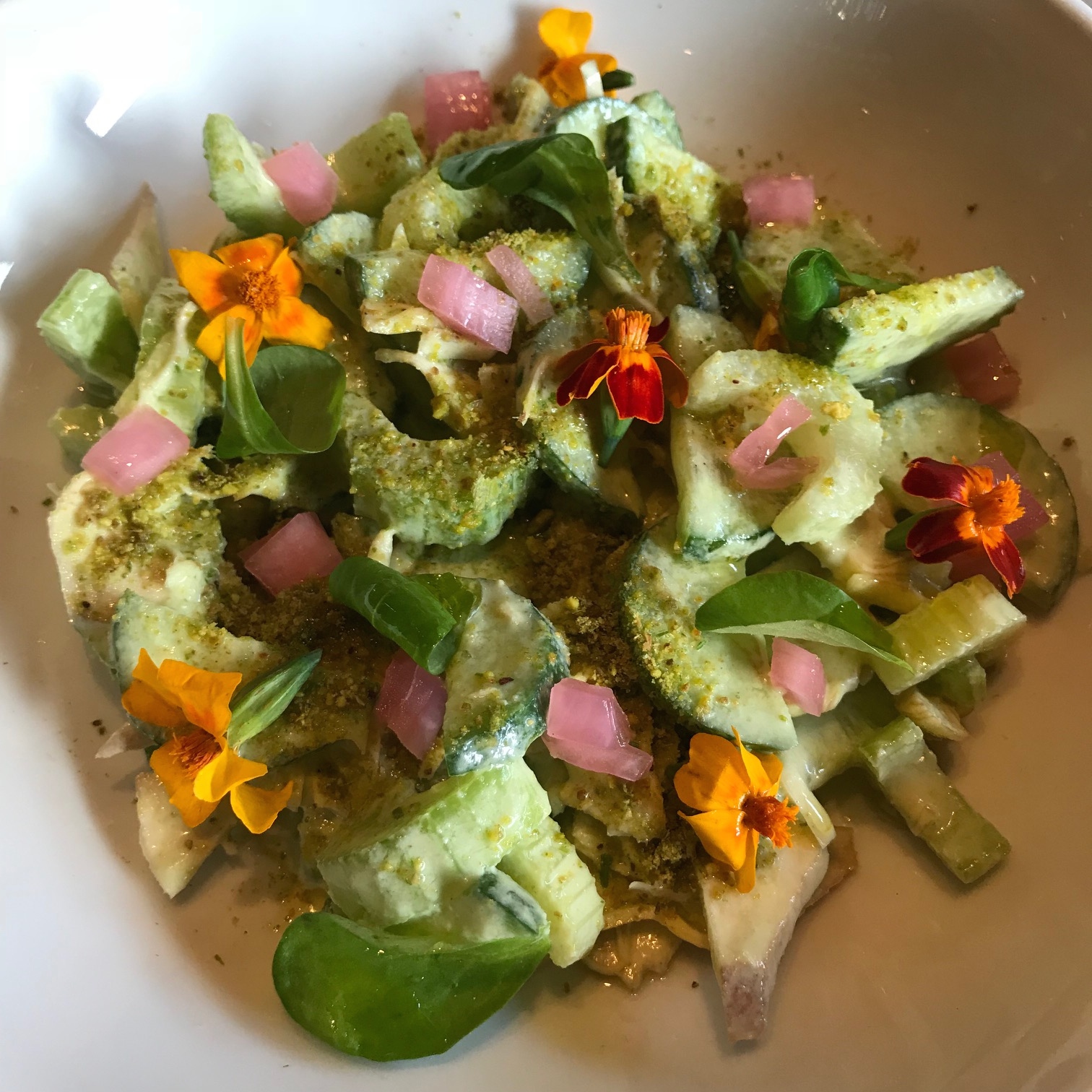 Along with the Malawach, we ordered a fragrant, delicate salad of Cucumber and Artichoke with orange blossom, pickled rose onion, marigold, green garlic and pistachio dukkah spice. There was a lovely rose essence that enhanced the salad ($15).