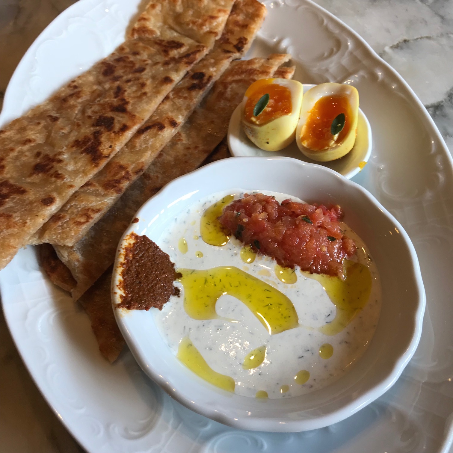 The flatbread was outstanding, but the garlic was overpowering in the dill creme fraiche ($17).