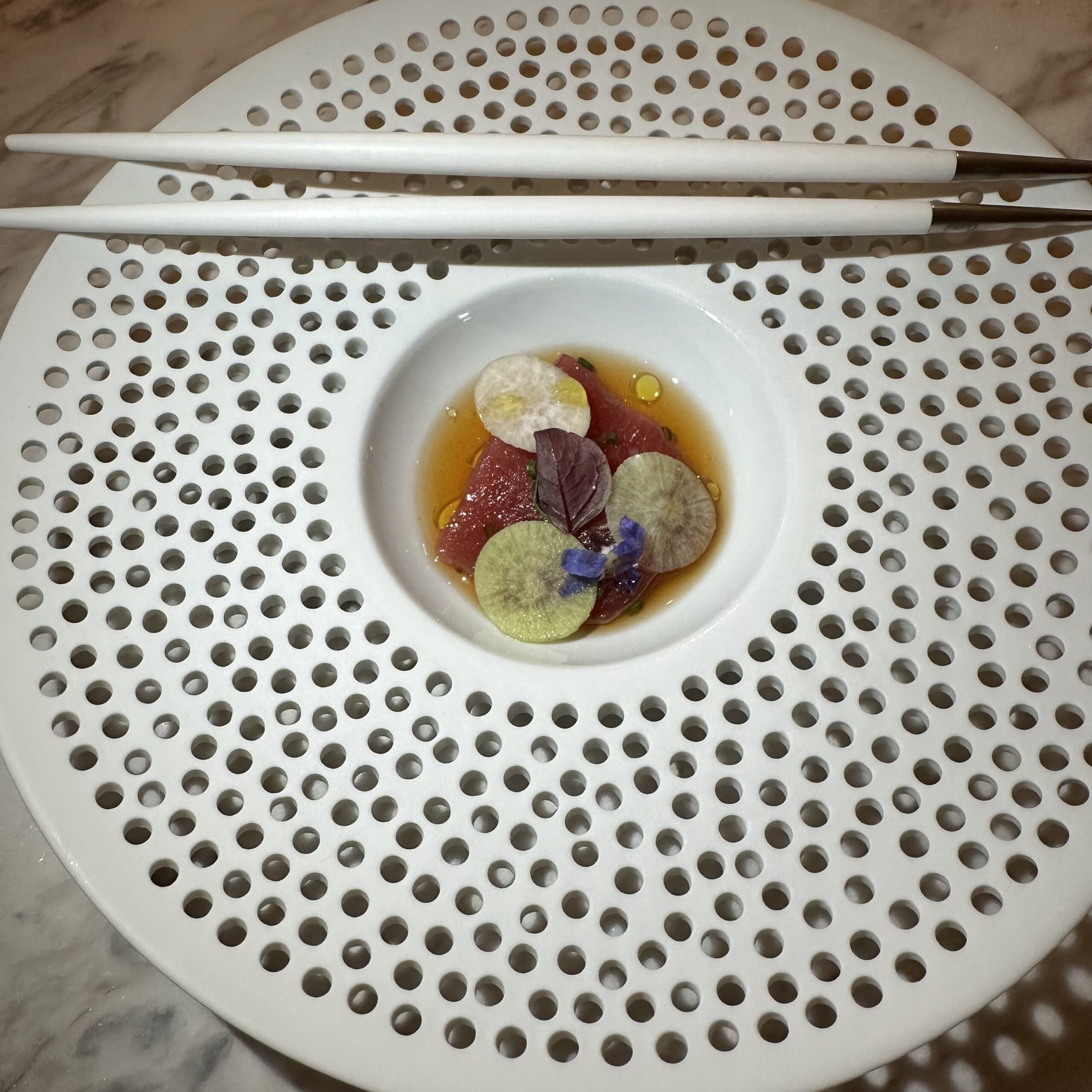 The first course was a luscious Bluefin Tuna with strawberry, yuzu and radish.