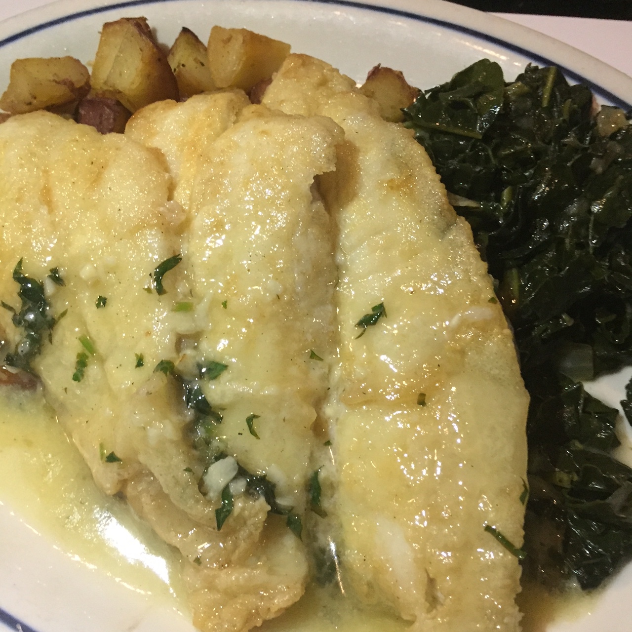 David ordered the California Sand Dabs which were tender, served with potatoes and braised greens ($17.25).