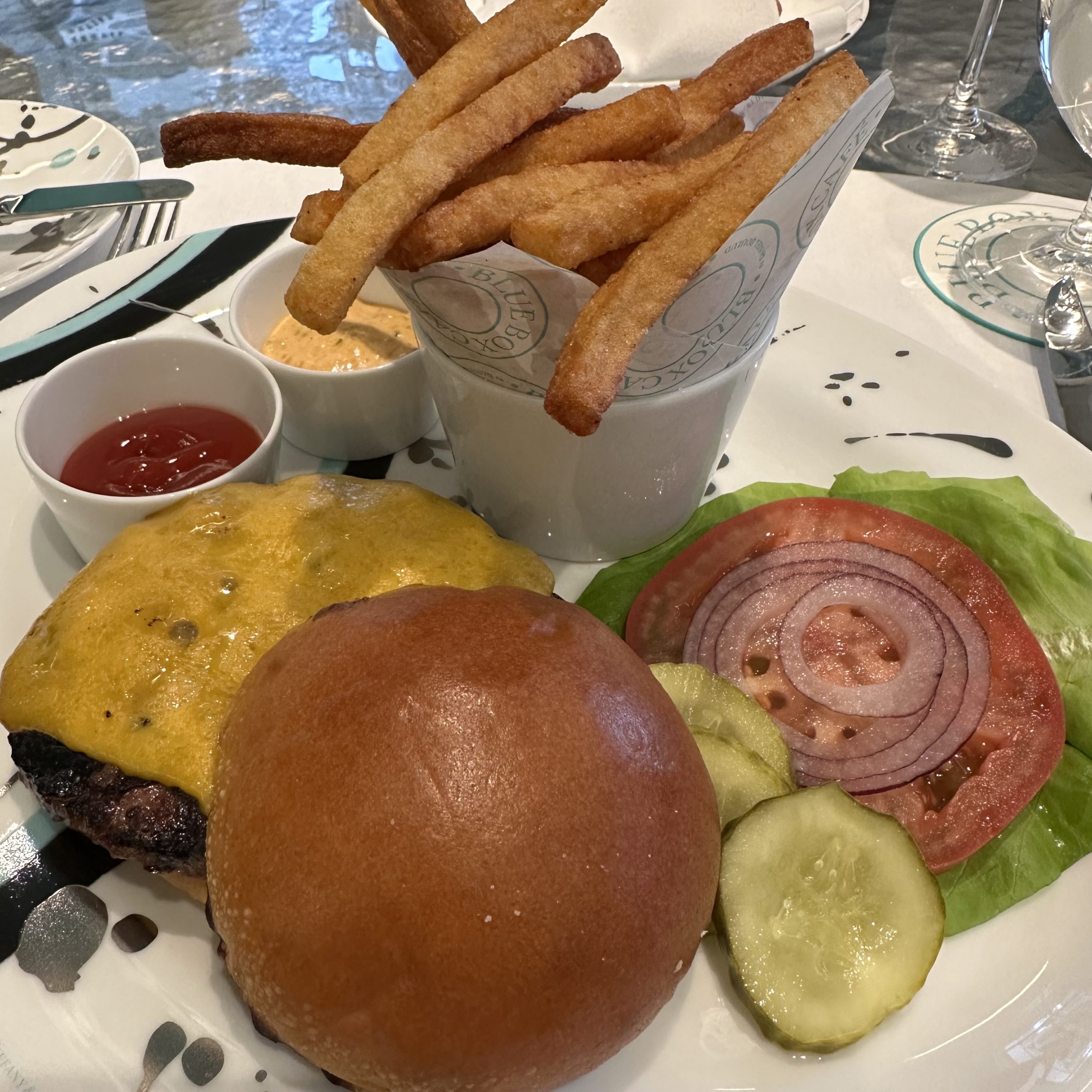 I ordered a terrific Black Angus Hamburger with cheddar on a brioche potato bun and the trademark Boulud french fries ($32).