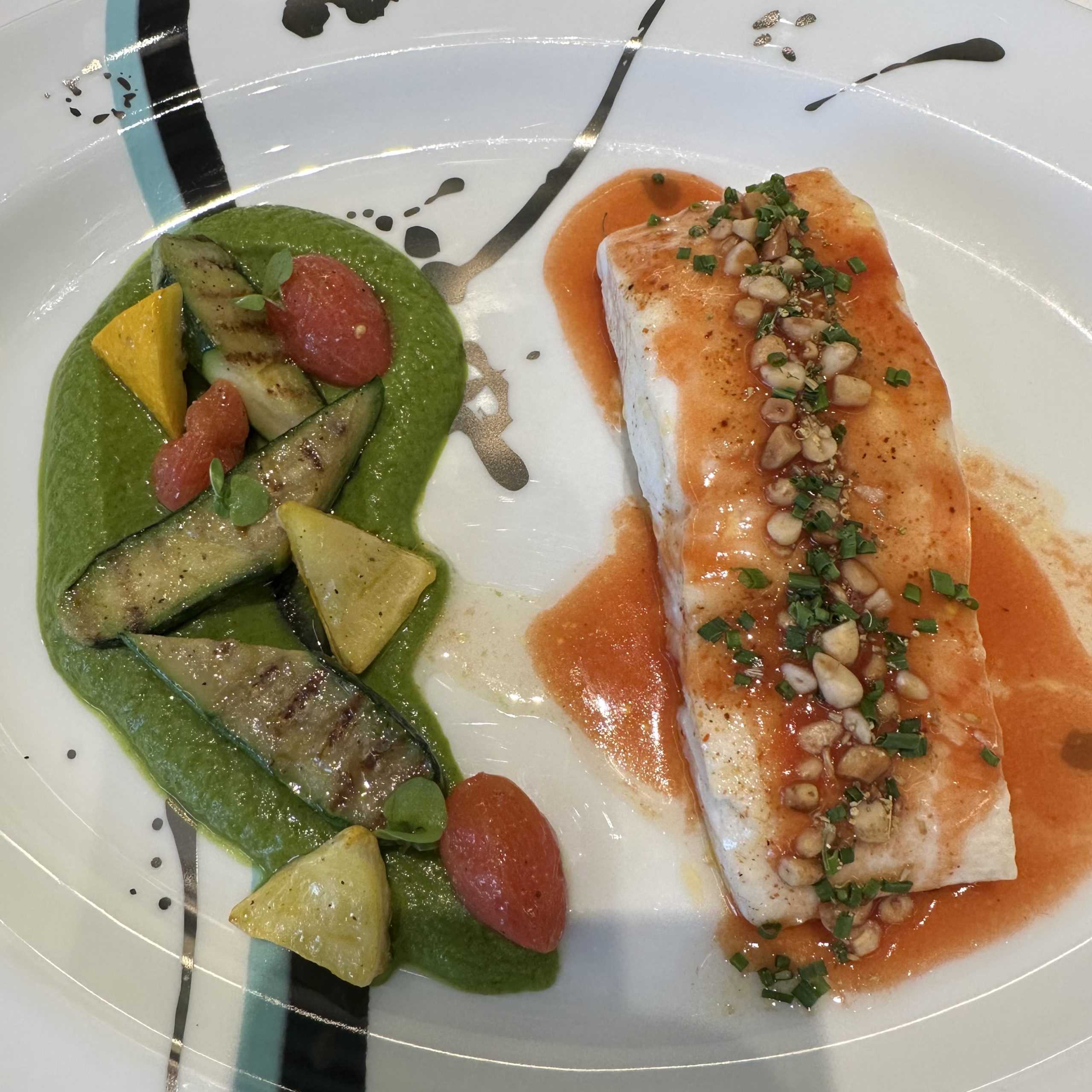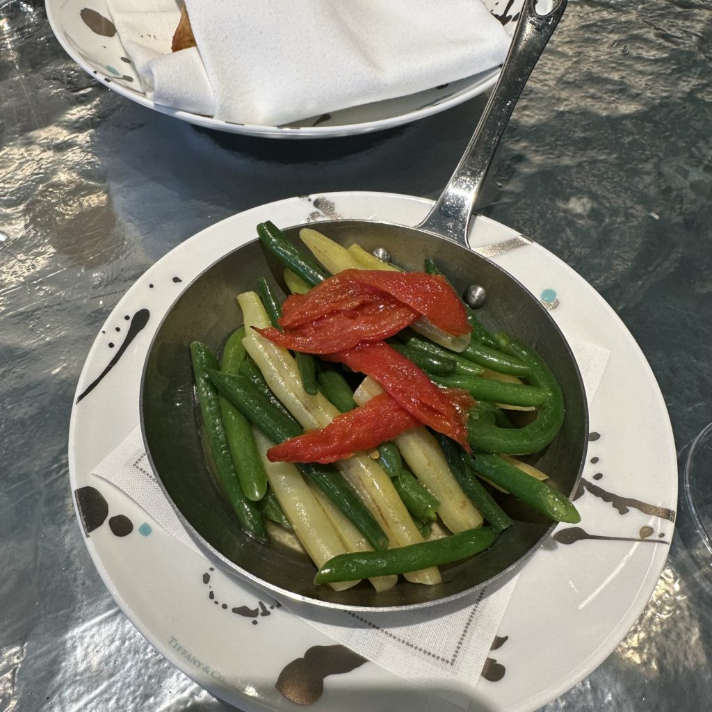 Do not get me wrong. My husband thoroughly enjoyed the experience. He indulged in a tantalizing Baked Halibut dish with zucchini, tomato and pine nuts ($38). He also ordered a Summer Bean side dish ($14).