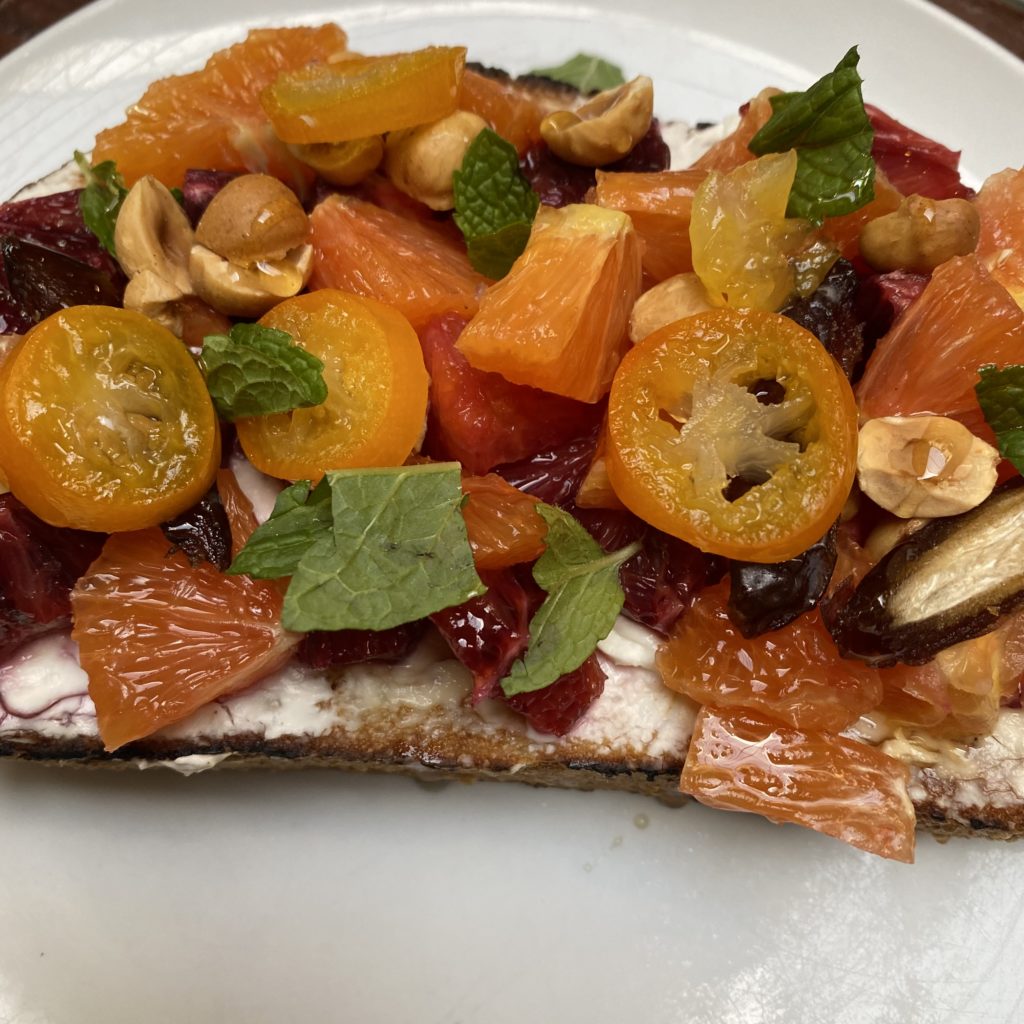 We selected the Gioiella Ricotta Toast with cara cara, blood Orange, dates, kumquats, hazelnuts and wildflower honey served on a thick slice of country bread ($16). It was amazing. Each flavor jumped out and then mingled into a delicious blend of fabulosity.