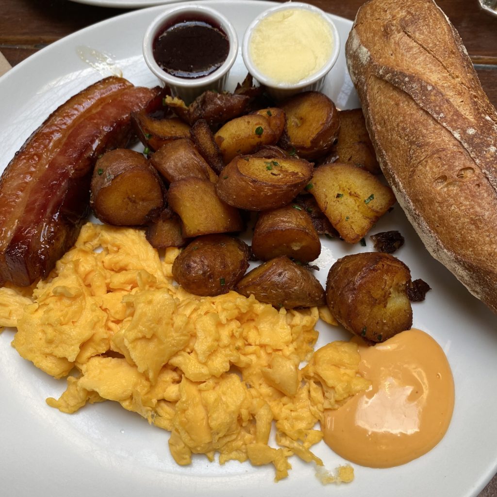 The Regular Breakfast was outstanding. The organic eggs were scrambled into orange perfection, the thick, huge slab of bacon steak was outrageous, the fingerling potatoes crispy and flavorful, the baguette crunchy accompanied by unbelievably creamy Normandy butter and jam ($21). I have been off eggs lately, but these were fabulous.