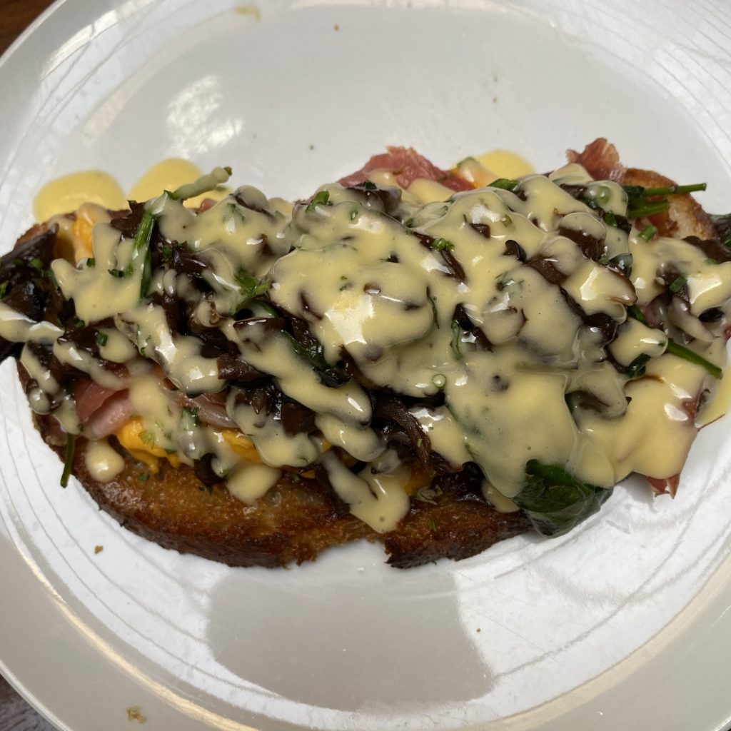 Anna chose the delectable Mushroom Toast which included house cured ham, spinach, hollandaise, red wine sauce and scrambled eggs ($19).
