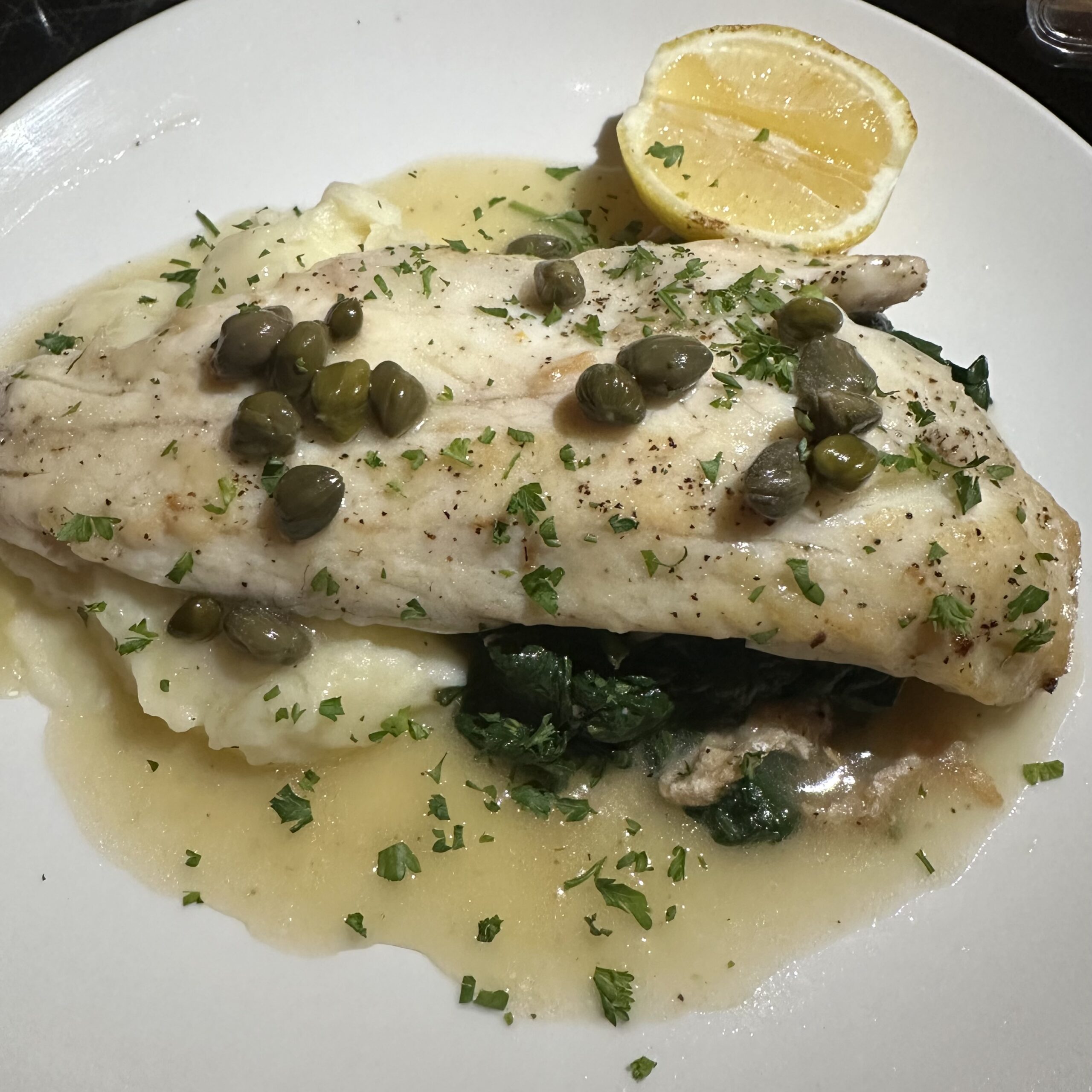 Branzino is trending in all restaurants. The Canto version is superb. The pan seared Branzino fillet is a thick cut of flaky fish in a terrific lemon caper sauce and wait for it, unbelievably, served with sides included. The mashed potatoes and sauteed spinach were great accompaniments ($36).