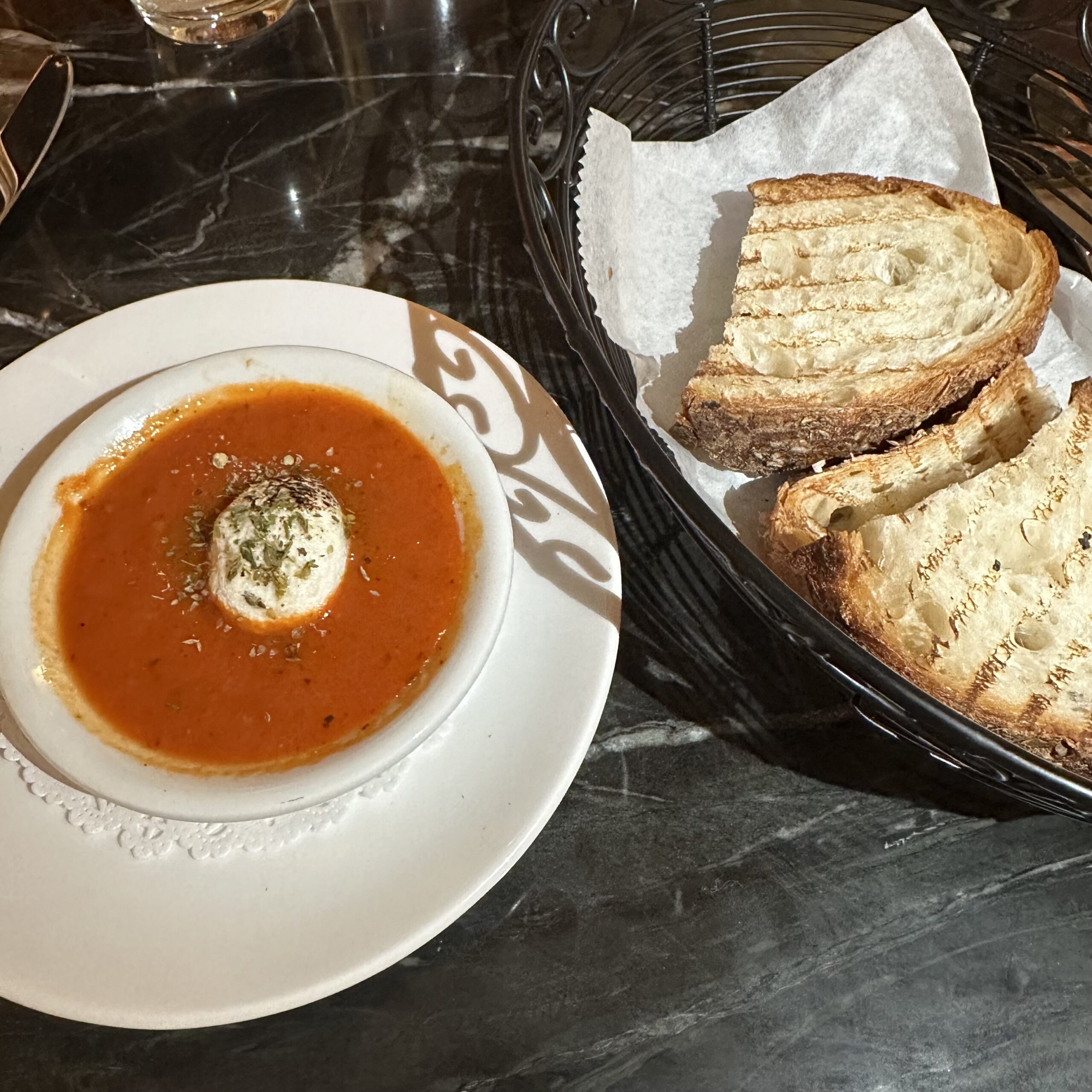 Customers are graciously offered slices of grilled bread with a side of sweet and delectable homemade tomato sauce adorned with a dollop of burrata to accompany the drinks.