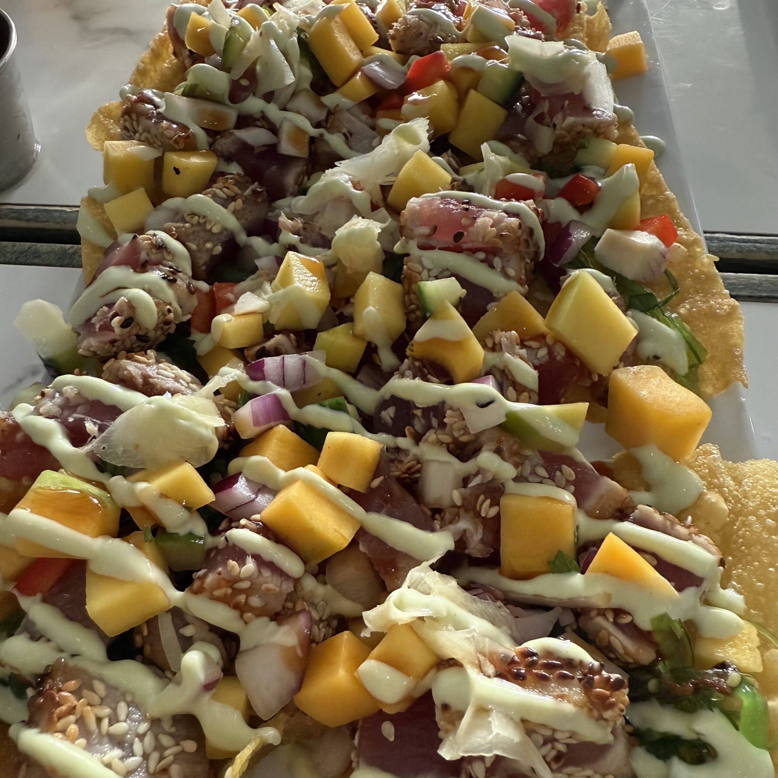 The Tuna Nachos are superb, served on a crispy, crunchy chip loaded with fresh tuna, mango and veggies ($26).