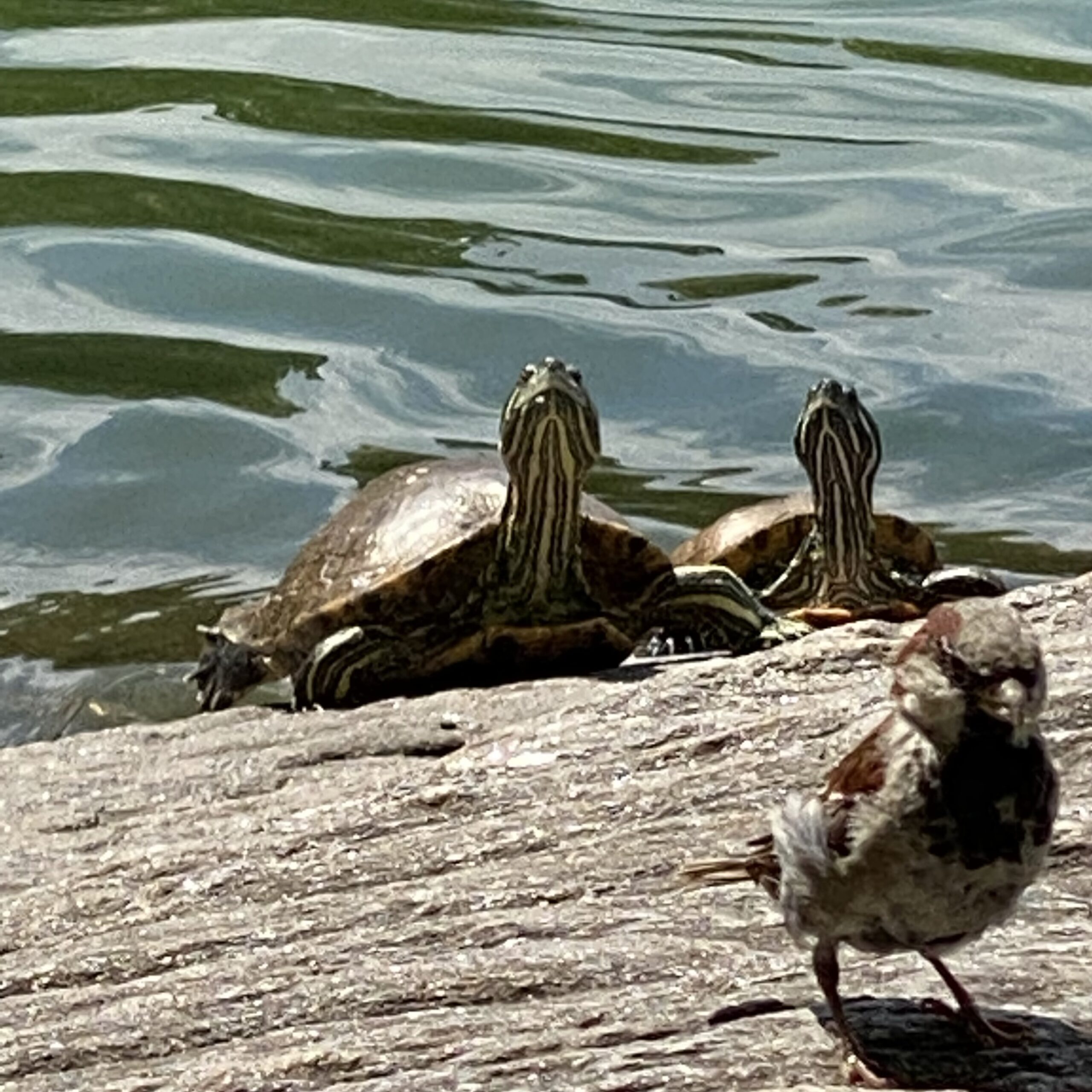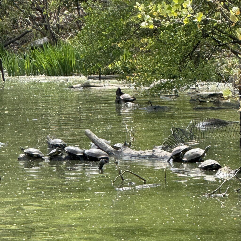 You welcome the turtles who have emerged and are sunny themselves on rocks and floating branches.
