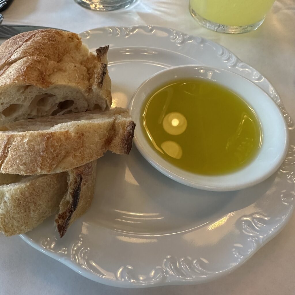 The Bread and a divine Spanish Extra Virgin Olive Oil along with a plate of olives awaits you at your table. The bread is crunchy with a light and airy center. A repeat portion of bread is an additional $5.