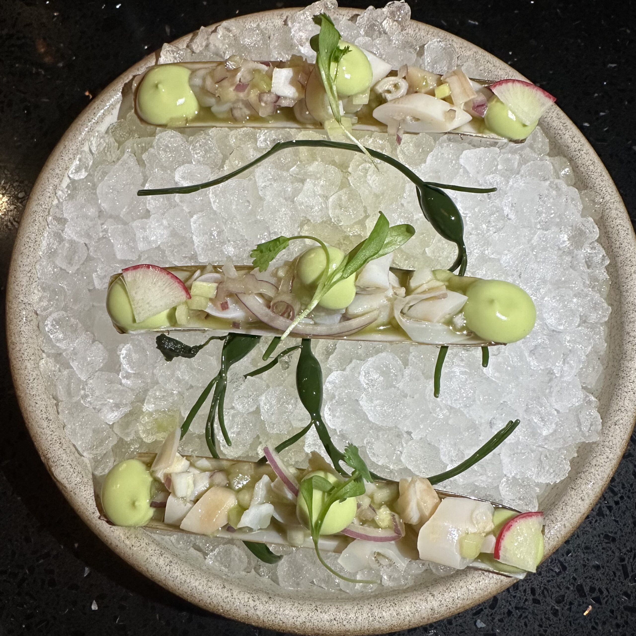 The salad was followed by phenomenal Aguachile Verde de Navajos which are Razor Clams. I adore and consume them with great frequency in France. Razor Clams are not a recurring menu item in America. These were delicious Cape Cod Razor Clams, prepared with Cucumber, Lime, Red Onion, Cilantro, Serrano Chili and Avocado ($25).