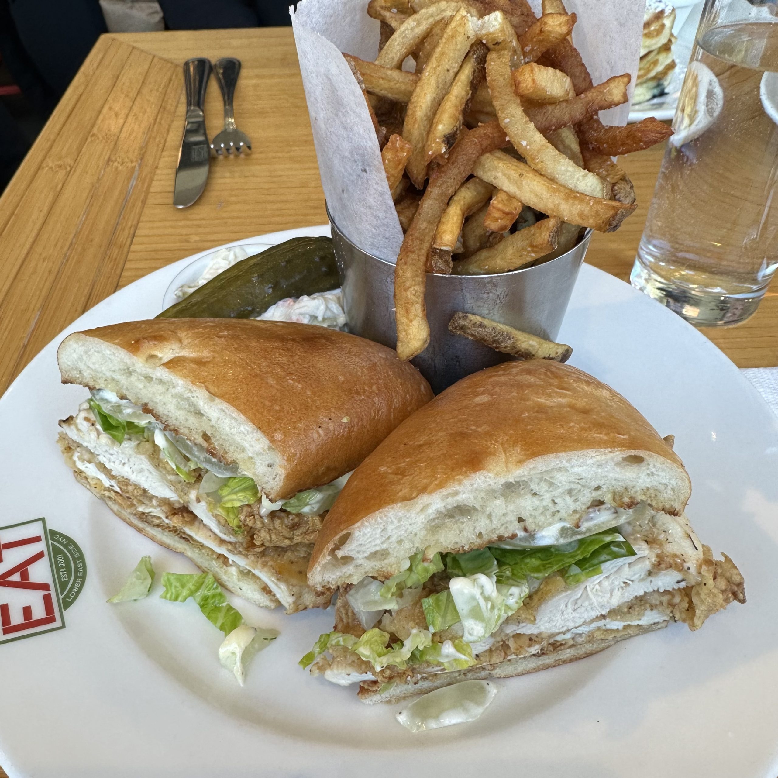 I ordered the Fried Chicken Sandwich with lemon-pepper mayo, shredded romaine, pickled green tomatoes on a Clinton St. Kaiser roll, with fries, slaw, and a LES pickle ($19).