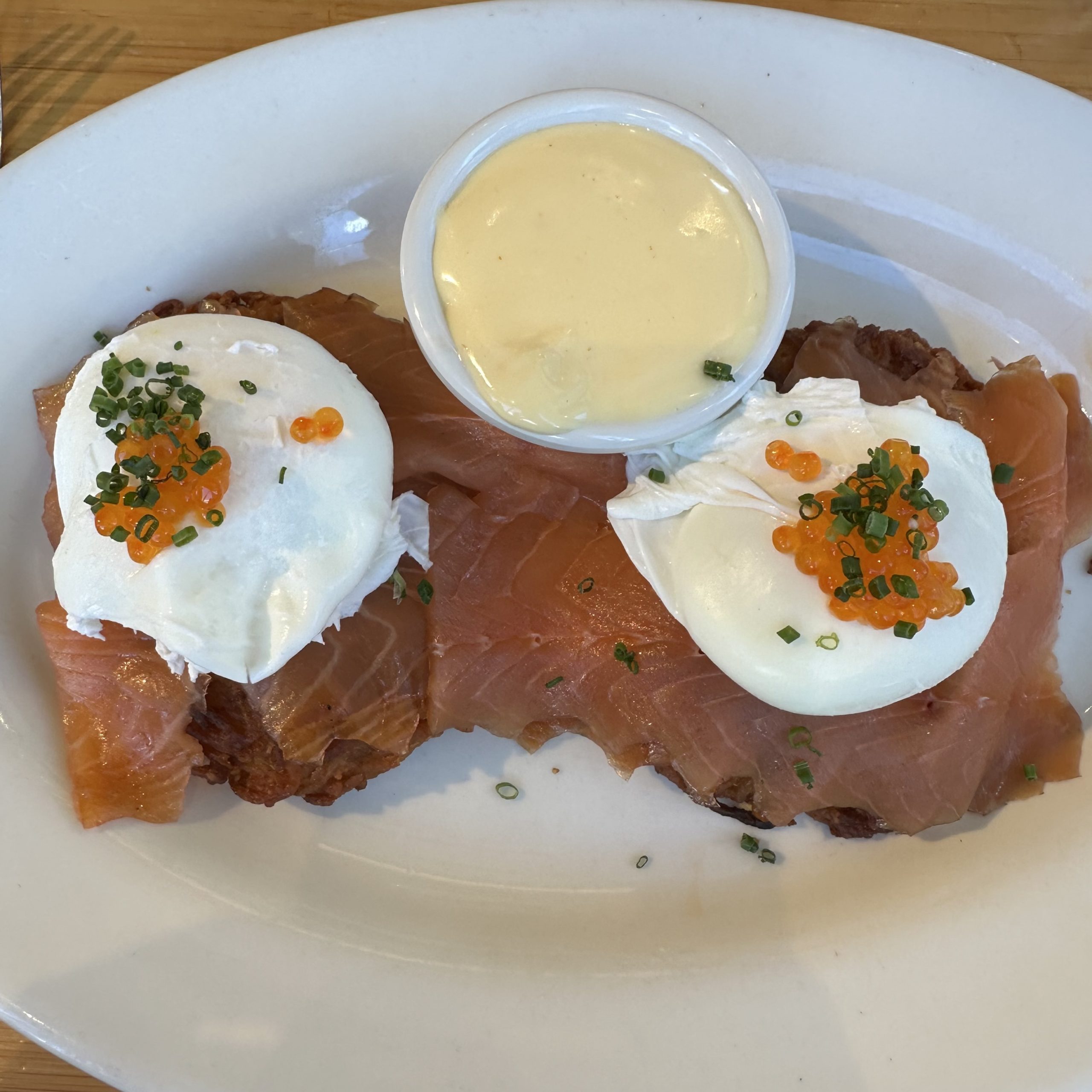 My daughter was excited about her Latke Eggs Benedict with poached eggs, house smoked salmon, classic hollandaise, trout roe caviar, over crispy potato The smoked salmon literally stunk to hell. That order was a complete waste ($23).