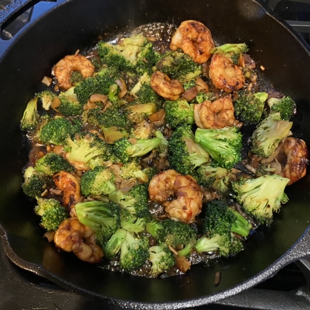 I sautéed the broccoli in a preheated cast iron skillet and added some of the shrimp marinade.