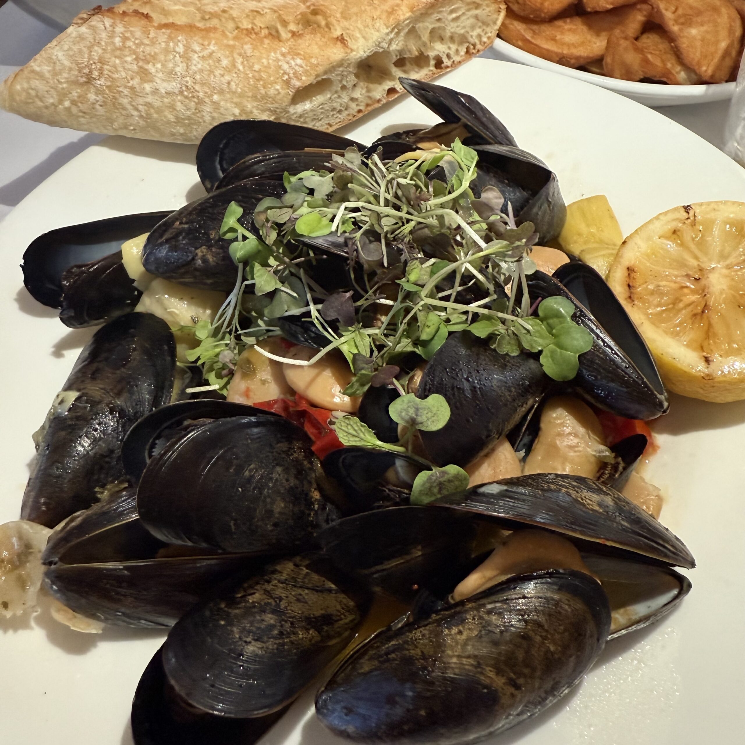 I ordered fresh Mussels in a tasty Prosecco butter herb sauce with Giganta beans, artichoke hearts, shallots, cured tomatoes served with a hunk of bread. The mussels were sweet and plump ($39).
