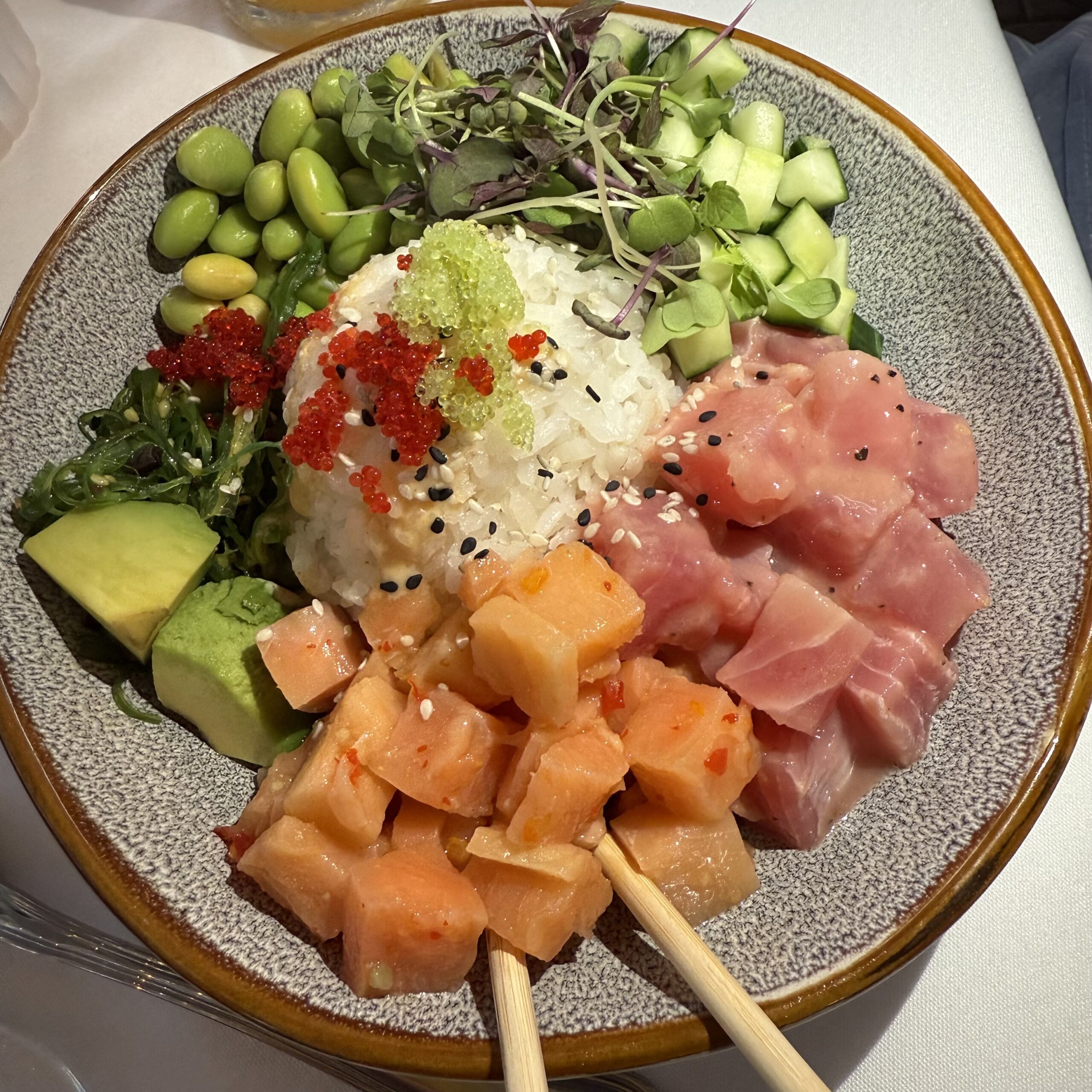 My husband opted for the Sushi Bowl with fresh tuna and salmon, avocado, edamame on top of jasmine rice. He enjoyed every bite ($33).
