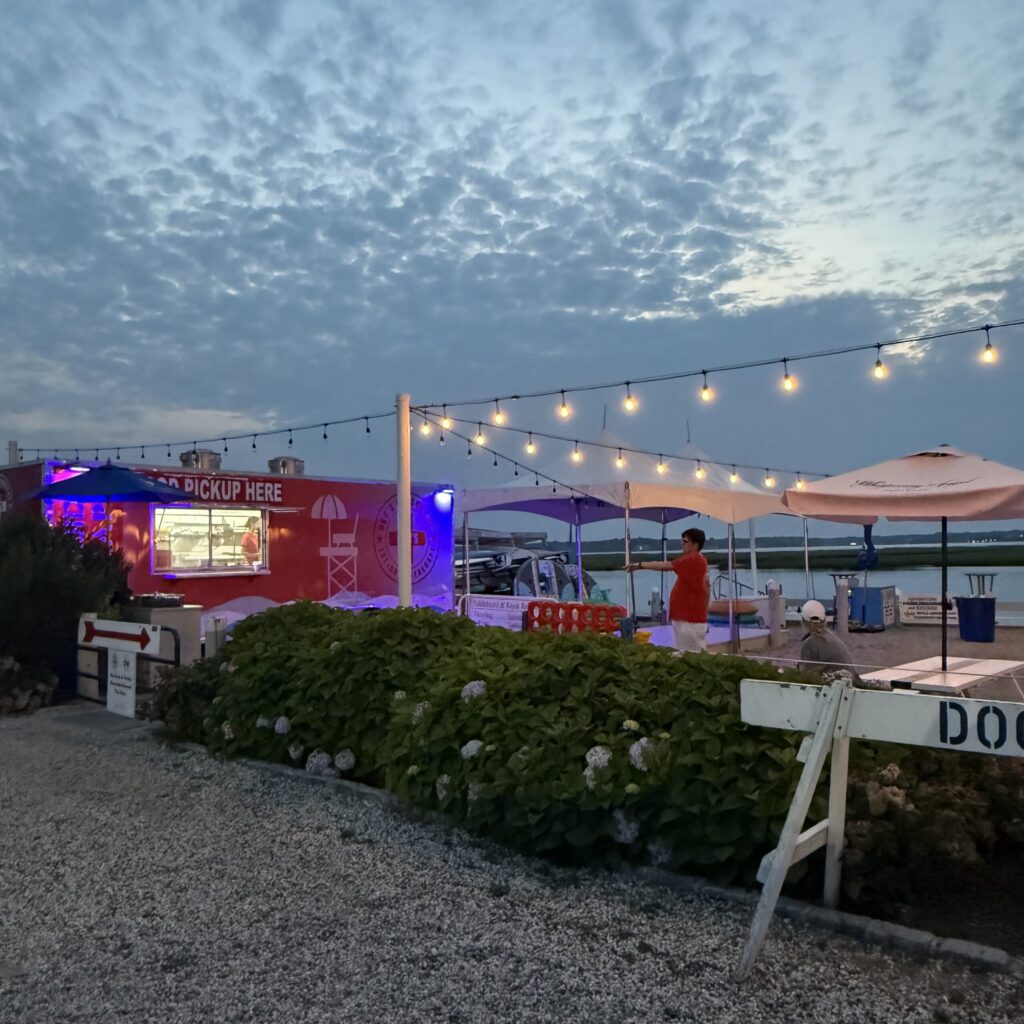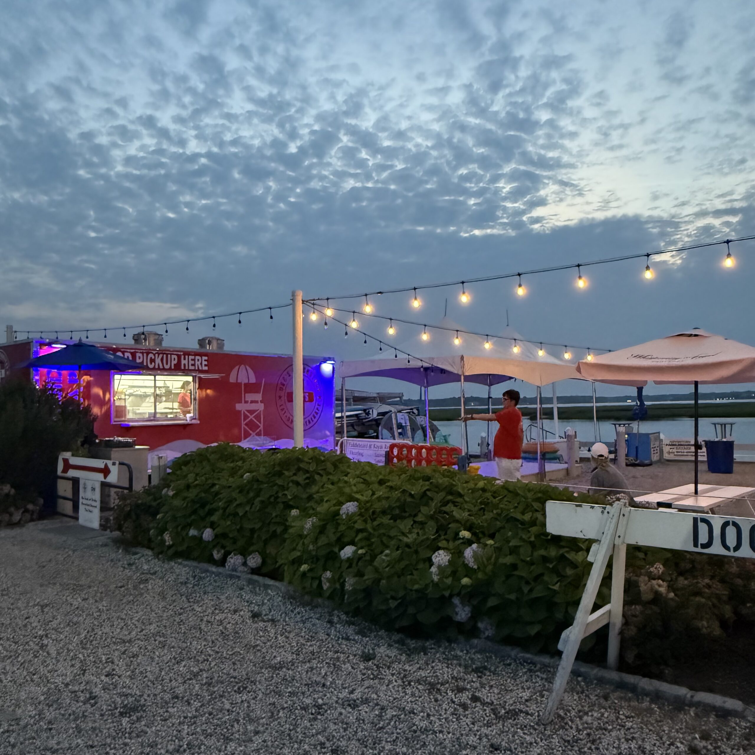 The picnic tables surrounding the truck all have water views. The menu is extensive. There is also an adjacent cocktail bar.