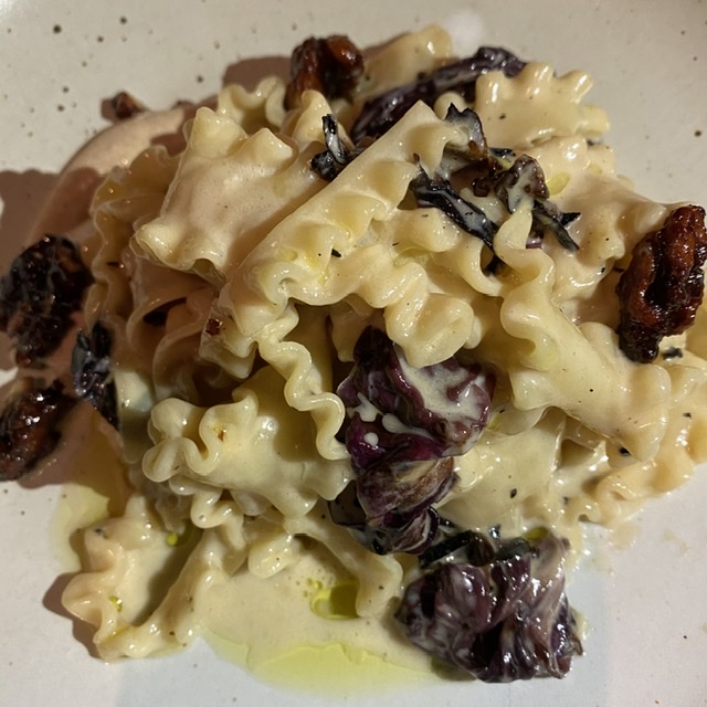 We carbed out and ordered the Semolina Mafaldine Pasta with Gorgonzola Dolce, pickled Trevino and candied walnut. It was good not great and even though they redid the dish the pasta and sauce was lukewarm ($16).