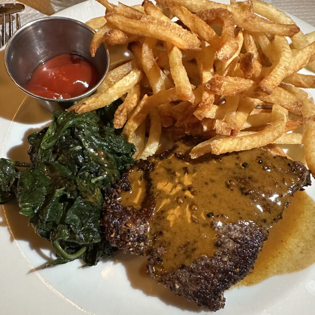 The juicy, flavorful steak was served with crispy French fries and sauteed spinach.