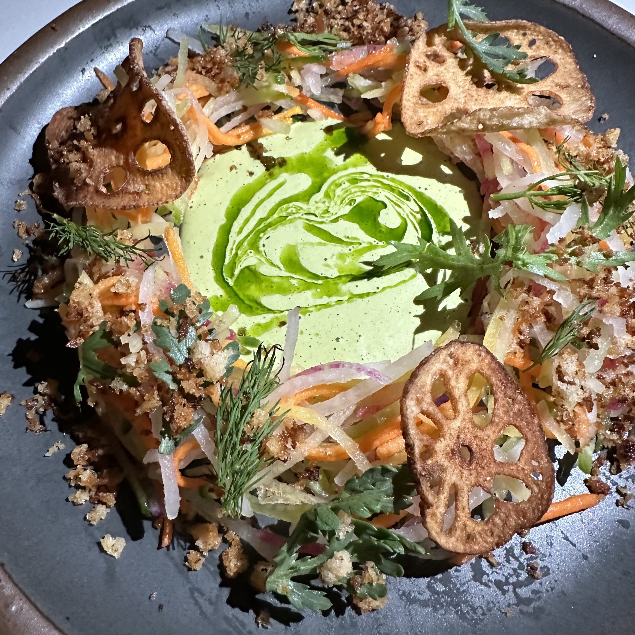 A new menu item, the Radish Salad, was delectably light and refreshing with chrysanthemum, lotus root chips and green guanyin tea ($23).