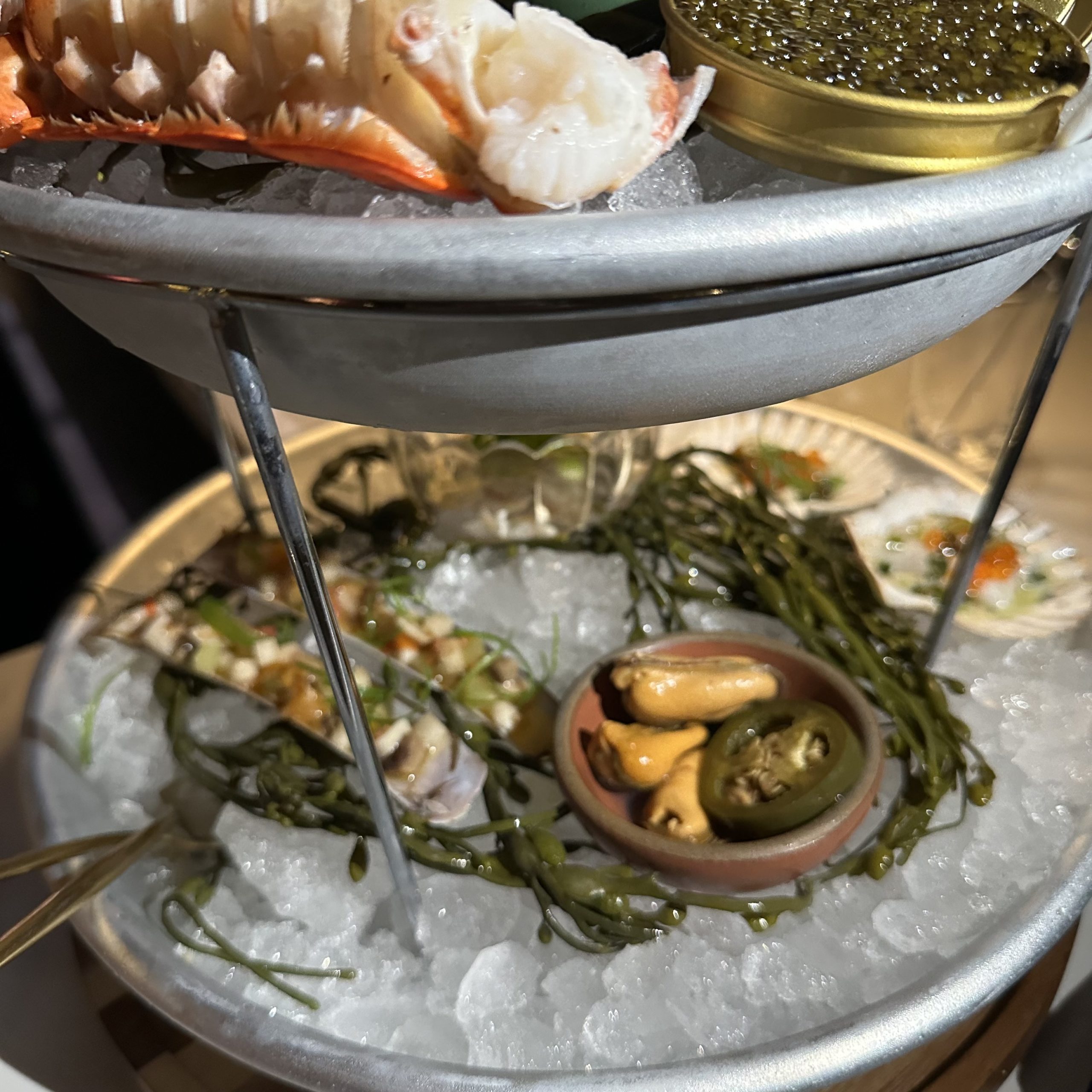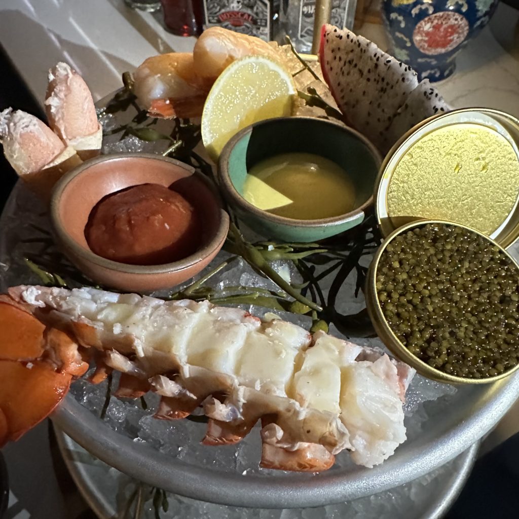 The sweet Nova Scotia Lobster Tail is outstanding steamed for six minutes and brushed with preserved lemon brown butter. The top tier’s pair of stone crab claws are fabulous and the jumbo shrimp are beyond reproach. The jalapeño-pickled mussels, scallop crudo topped with bright roe, Shanghainese smoked fish salad with fried saltines and beautifully arranged razor clams, thinly sliced and dressed with celtuce, daikon, vegetarian semi-dried-tomato and shiitake XO, are all outrageous.