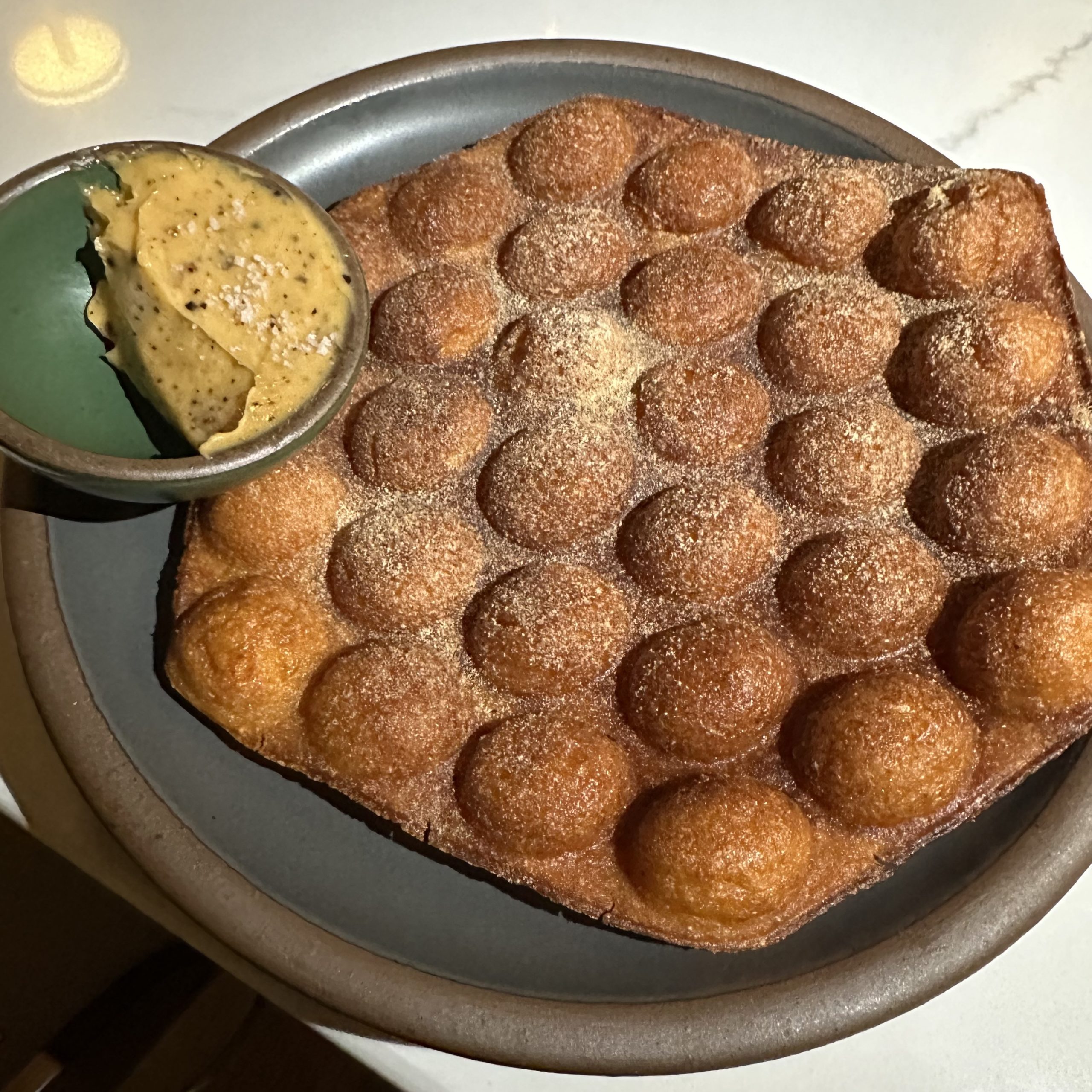 The Hush Puppy Egg Waffle made with Anson Mills cornmeal, white cheddar and served with hot honey butter was fantastic ($16).