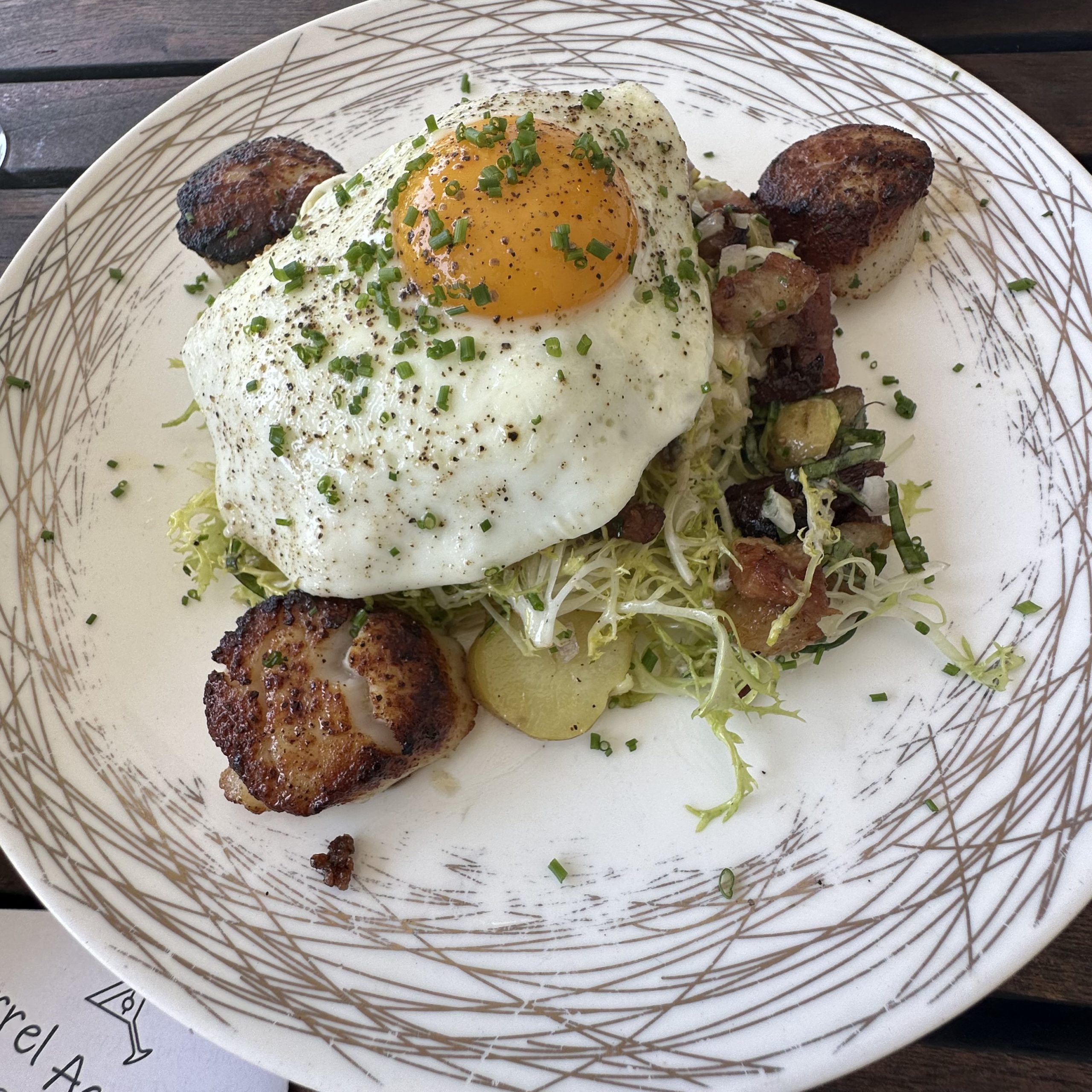 Our starter was a grilled fresh Scallop Salad perched on top of perfectly dressed frisée with lemon aioli, crispy bacon, fingerling potatoes and a sunny side up egg. The flavors were amazing ($21).