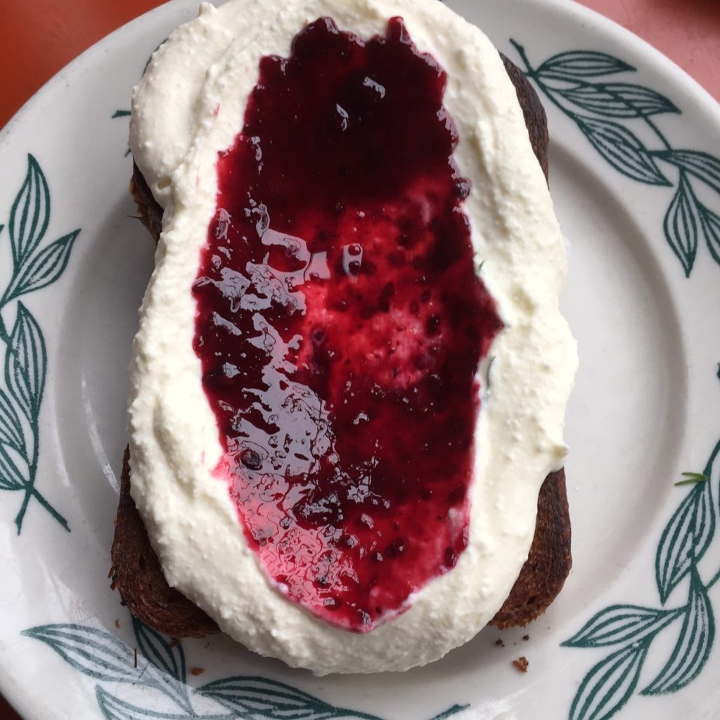 The Famed Brioche Ricotta Toast was amazing. The ricotta so creamy and jam scrumptious ($8).