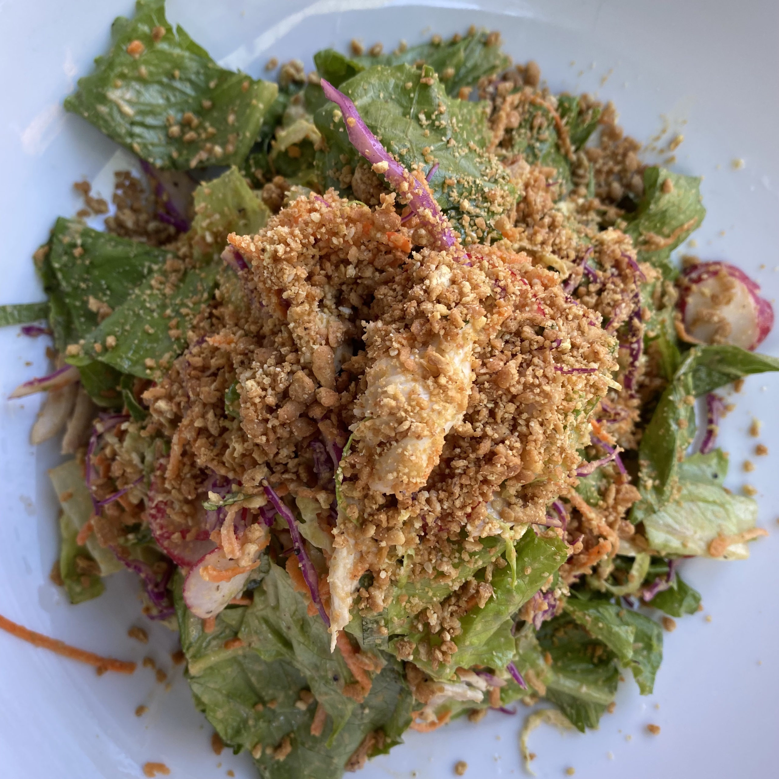 We also ordered the Peanut Chicken Salad with romaine, shaved brussels sprouts, avocado, carrots, sesame sticks, radishes and a unusual and tasty peanut dressing ($26).