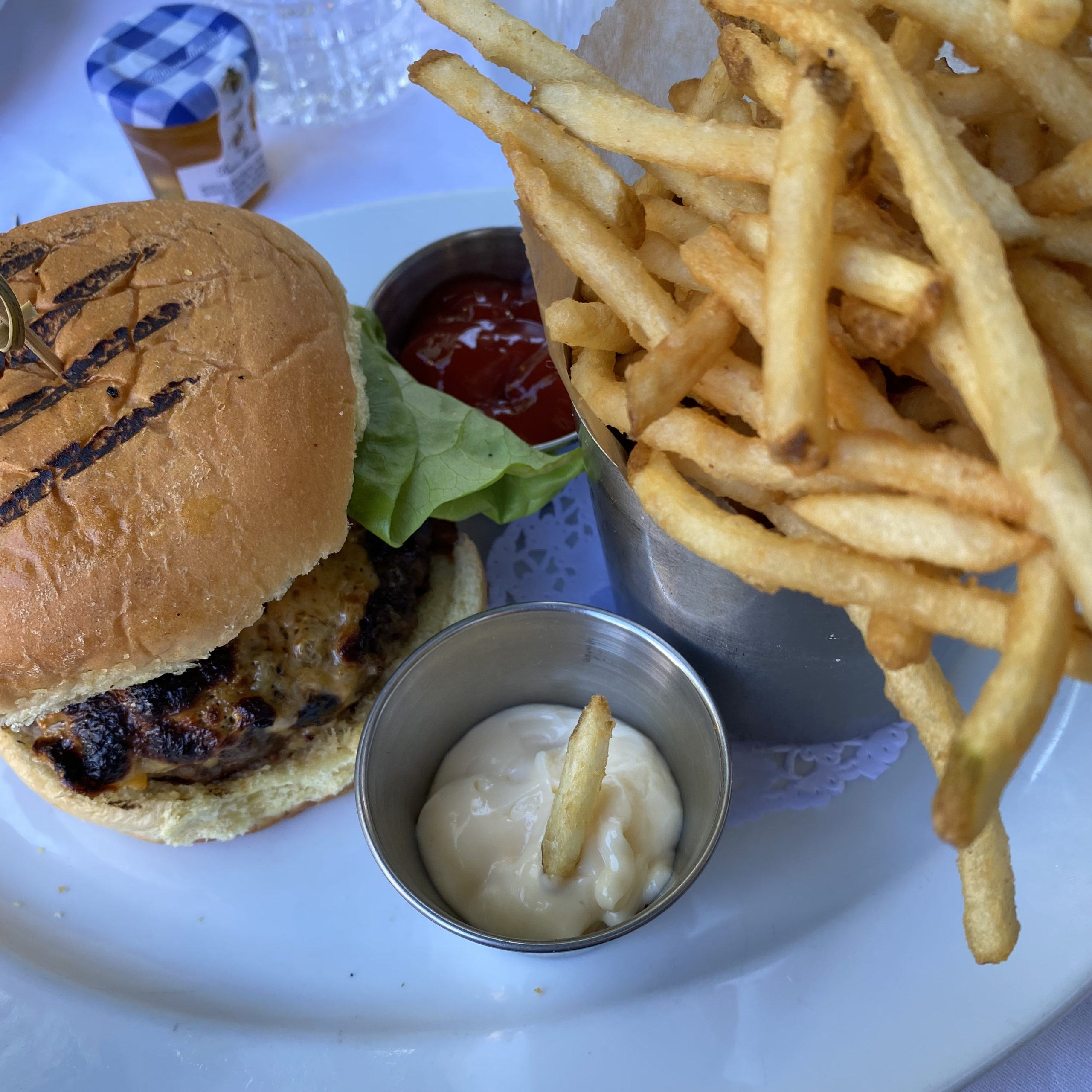 My daughter and I shared a delicious grass fed Brunch Burger with onion jam, american & cheddar cheese, mayo, lettuce, tomato accompanied by crispy fries ($24).