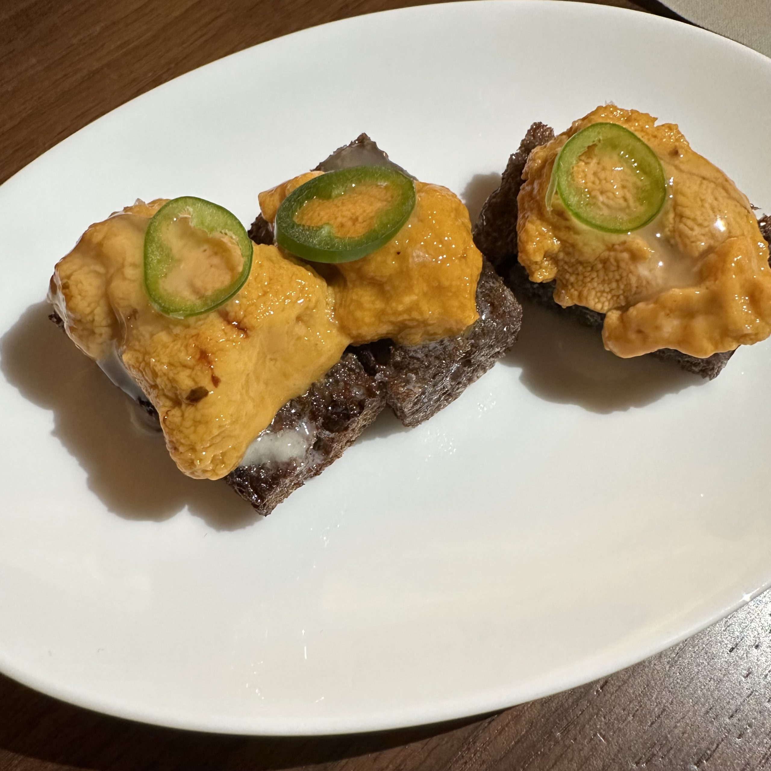 We started with Sea Urchin & Black Bread Crostini with salted butter, yuzu and Serrano chilies ($28). It was creamy with delicious Santa Barbara Uni.