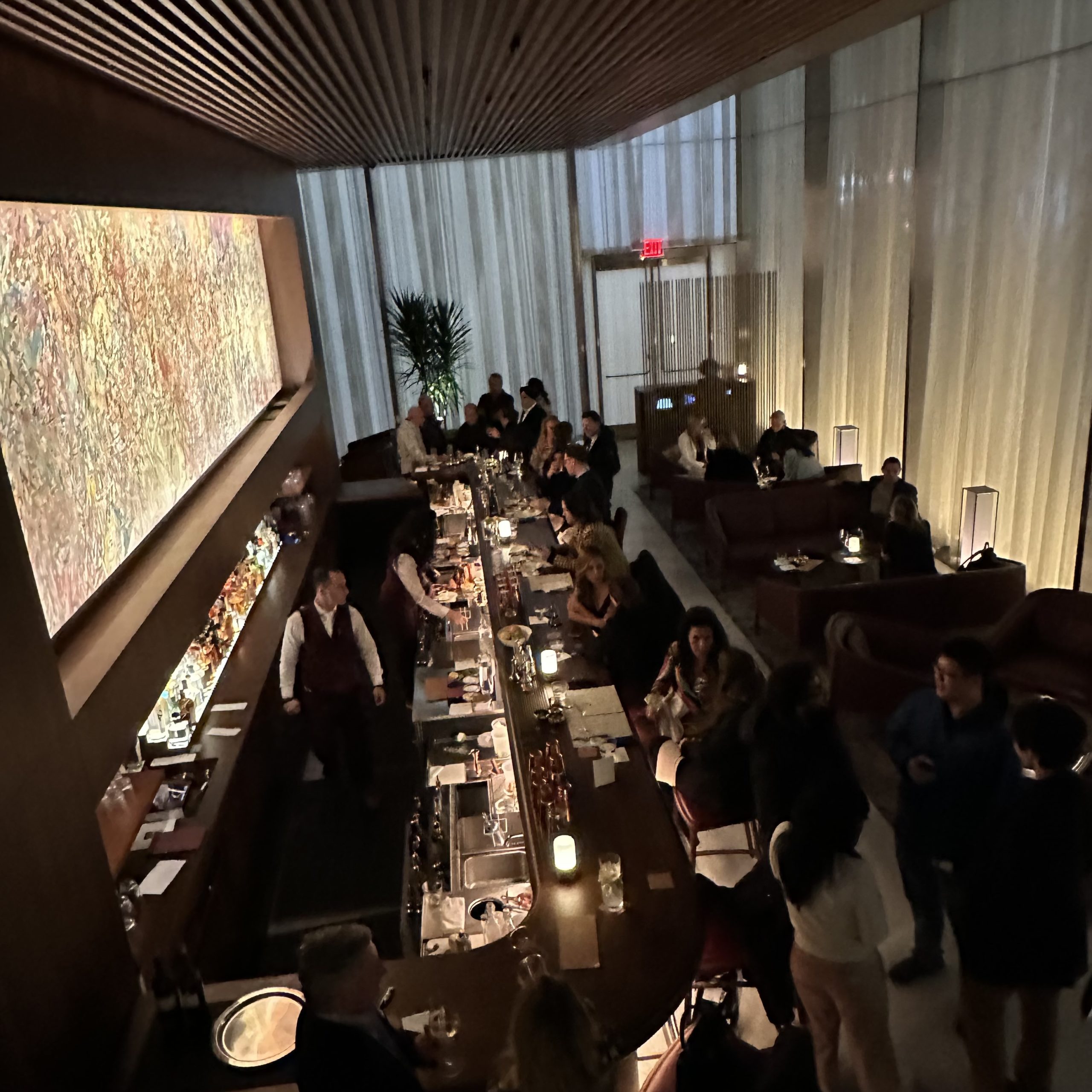 The captivating cocktail lounge and downstairs bar feature 45-foot high ceilings, complemented by a 24-foot painting created by artist Larry Poons.