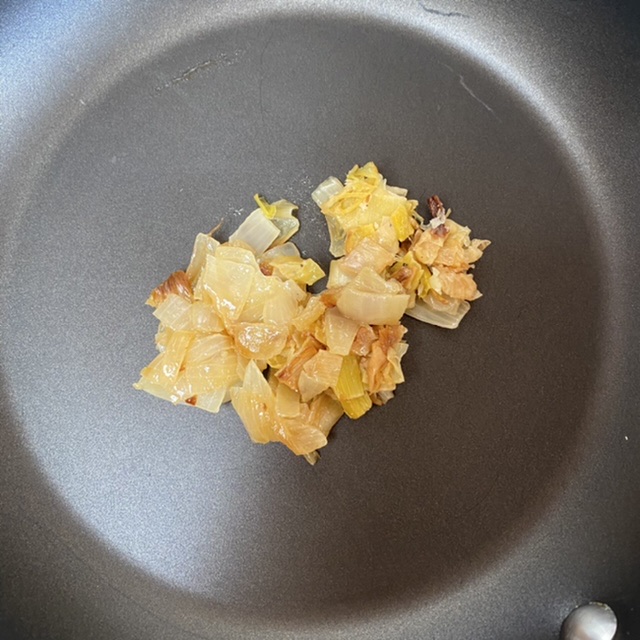 In a medium 8 or 9 inch fry pan place a tablespoon of sautéed leeks ( I always have them at the ready).