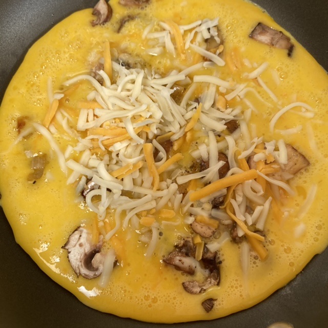 Allow the eggs to settle then sprinkle the cheese over the entire omelette.