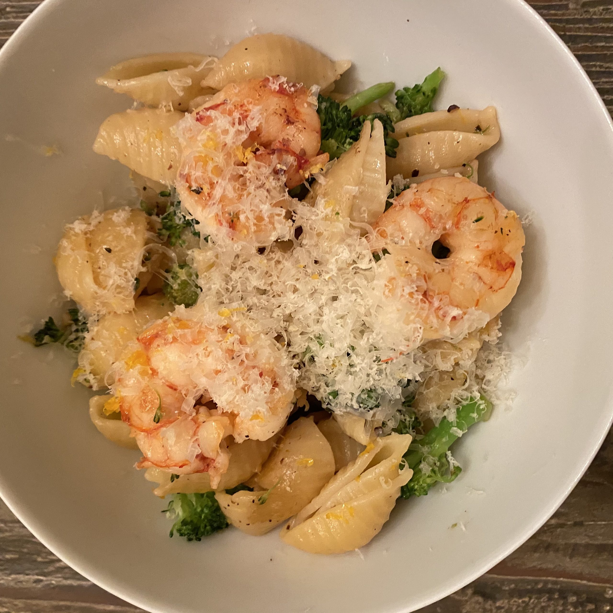 I had a newish bag of broccoli in the refrigerator and jumbo shrimp in the freezer.