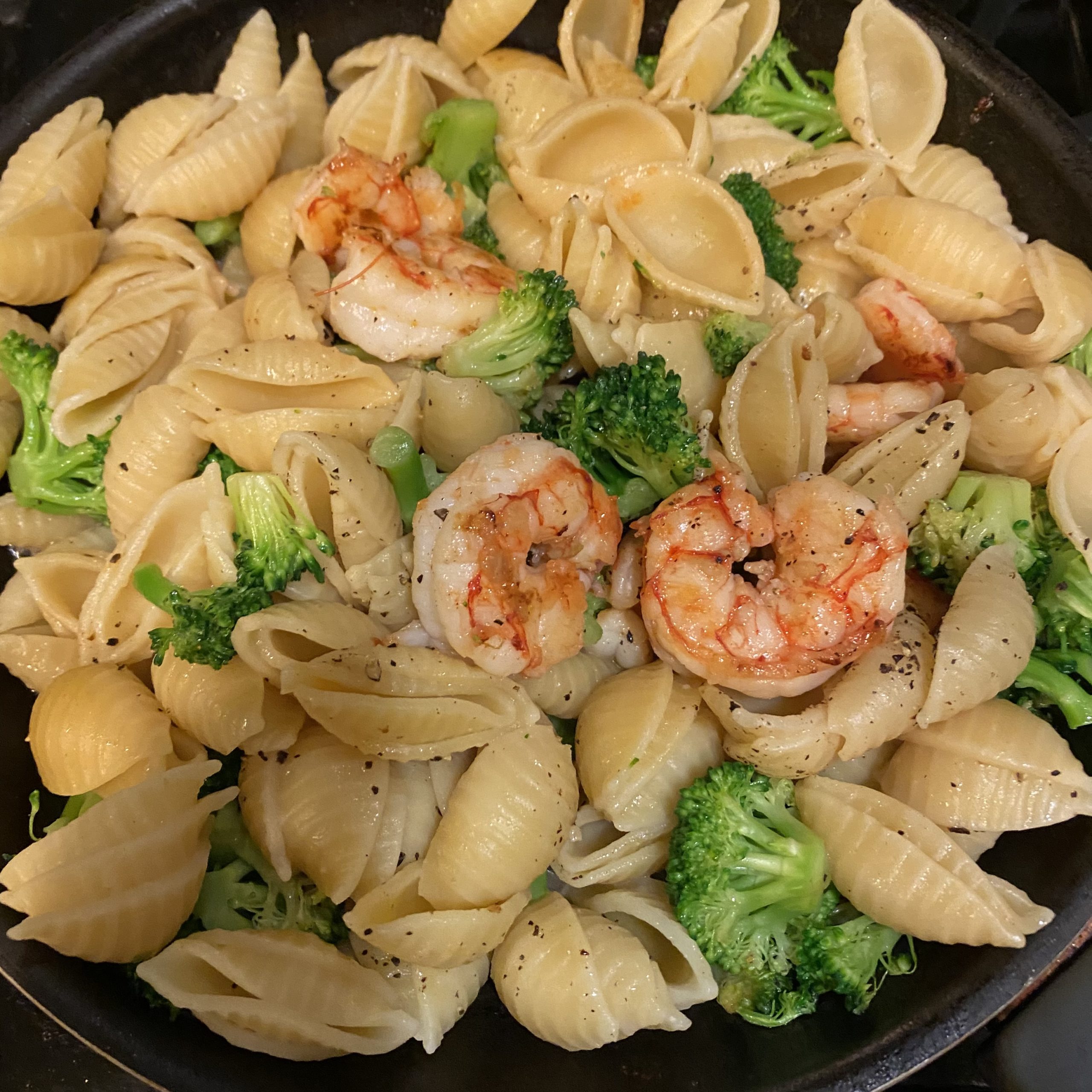 I combined 2 cups of pasta and 3 tablespoons of pasta water to the broccoli and then tossed in the shrimp, cooking/stirring  for 3-4 minutes.