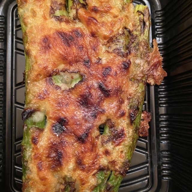 The Baked Asparagus with butter and parmesan cheese was delicious, but the cheese was cold and of all the reheated items this held up the best, but I had to remove some of the cheese and blot the excess oil ($11).