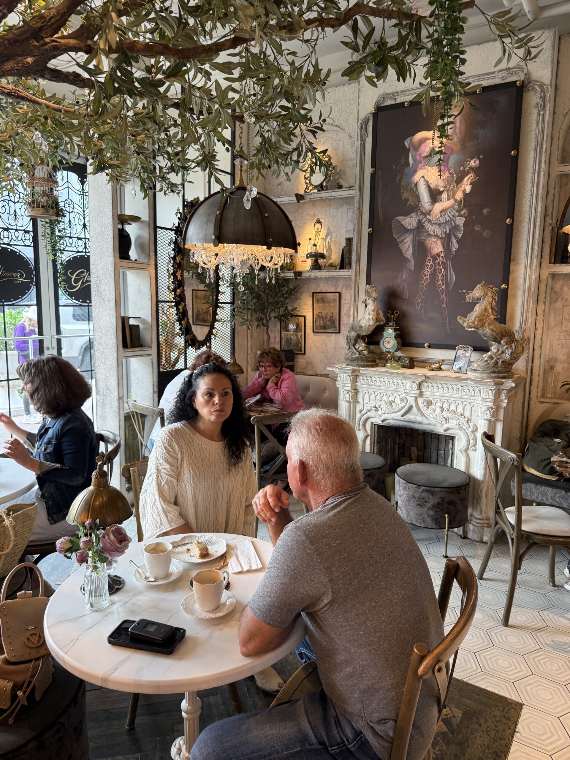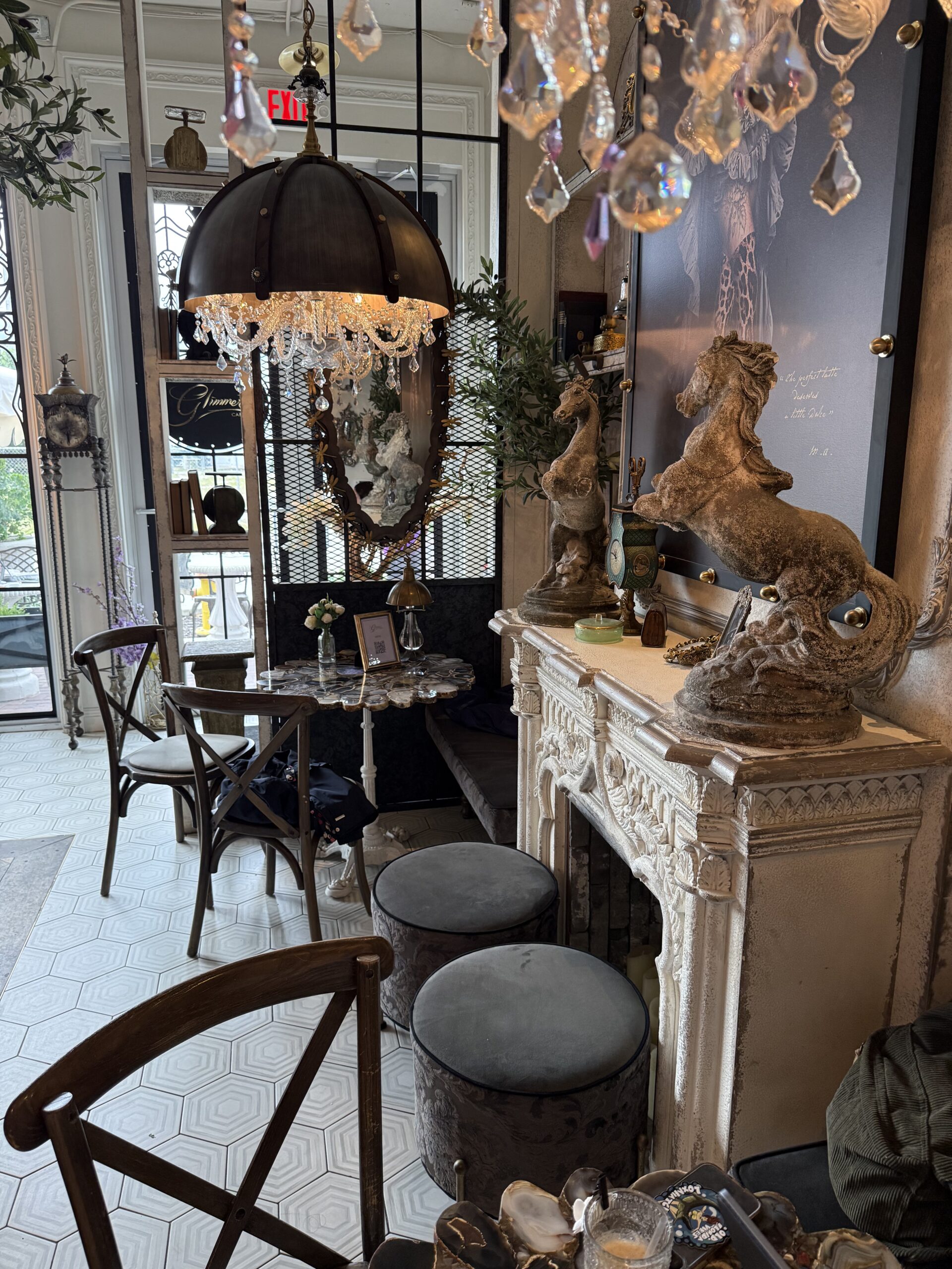 There is so much to digest at Glimmer…delicate lattice iron work, chandeliers, a carved fireplace, a tree in the midst of the restaurant.
