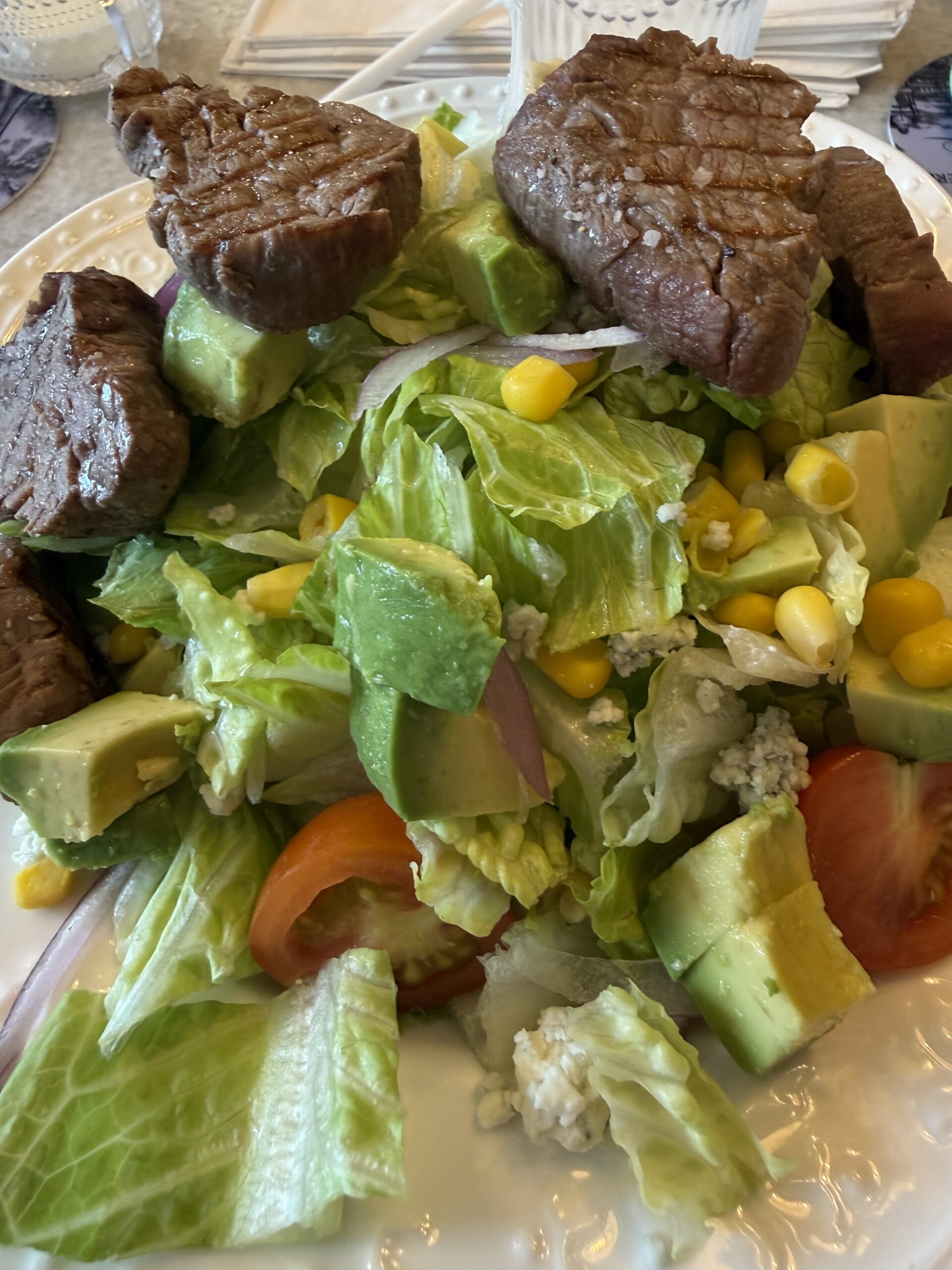 I jumped in head first and selected the Steak Salad. The meat was delectably tender. The salad included cherry tomatoes, fire roasted corn, avocado, red onions, blue cheese, romaine lettuce, and an outstanding cilantro aioli dressing ($24).