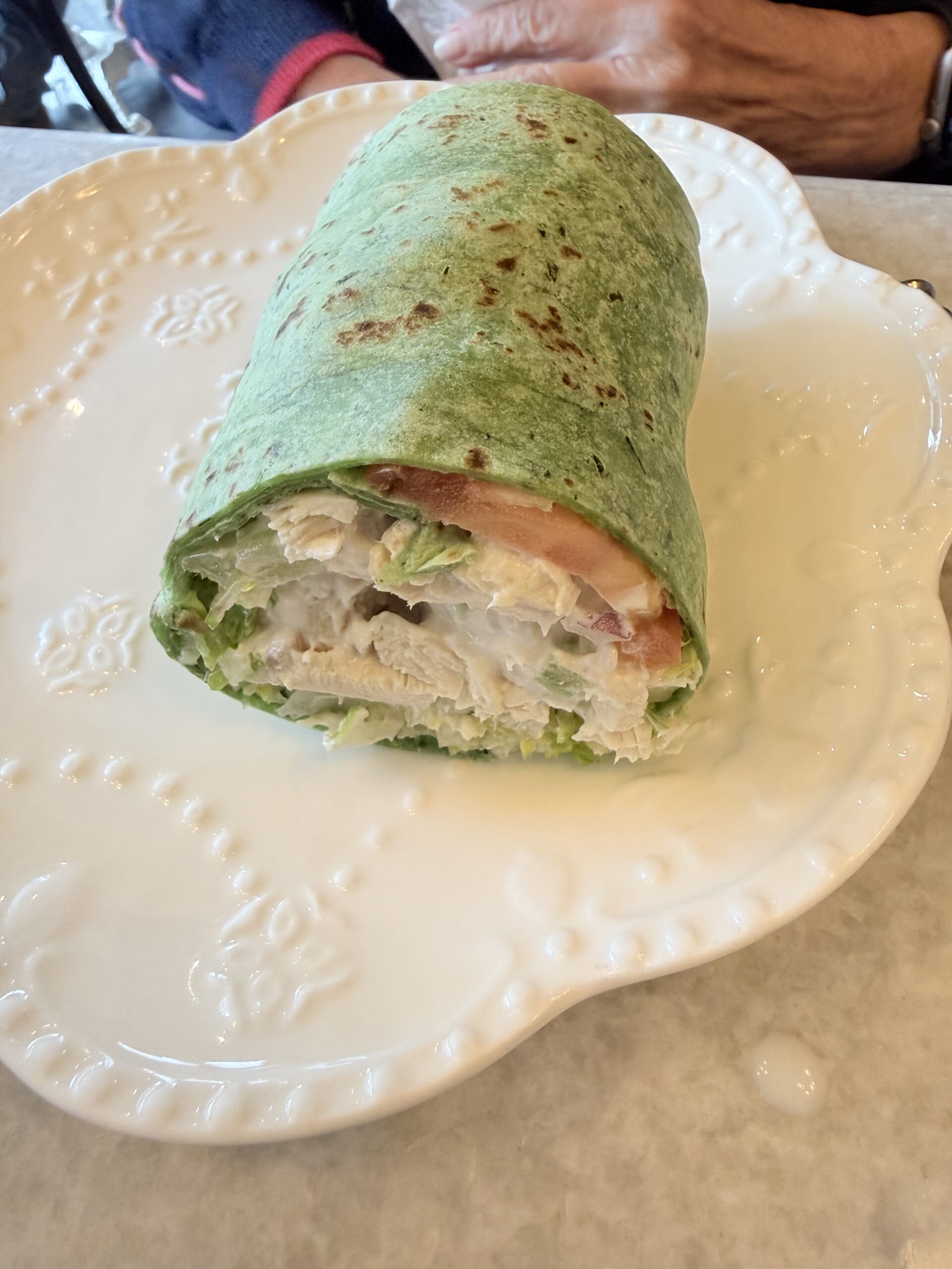 Swimming tandem comprised of Iris and Sue split the Chicken Salad Wrap made with housemade grilled chicken salad, red onions, celery, mayo, lettuce, and spinach in a herb flour tortilla ($16).