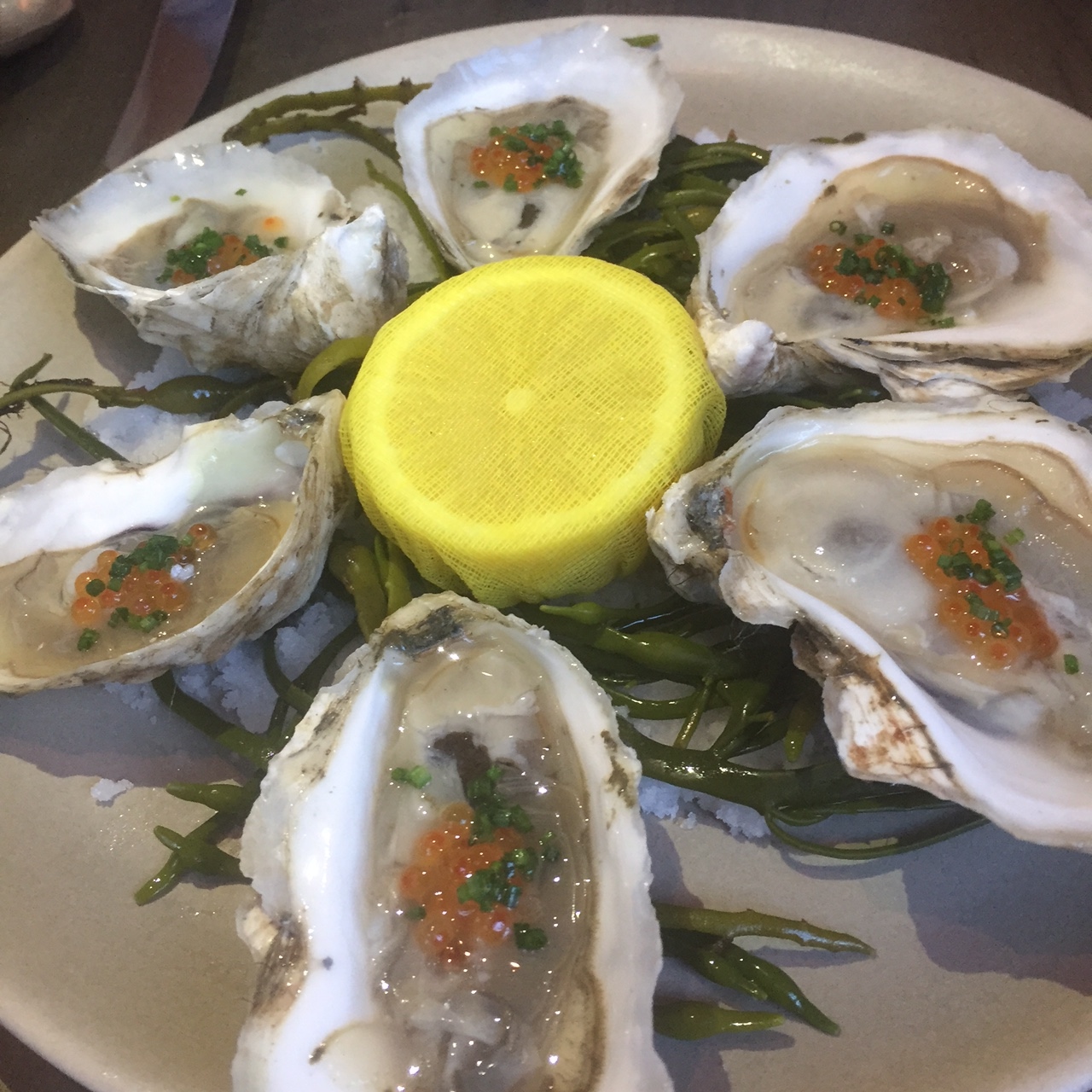 Once the adult beverages arrived we ordered fresh oysters that were smooth and tasty. I quite liked the dollop of trout roe placed on each oyster (6/$18 when did oysters get so pricey?!)